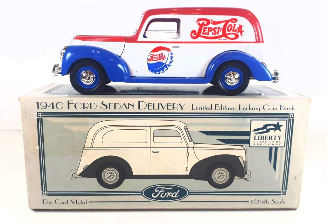 1940 Ford Sedan Delivery limited edition. Die cast metal with locking coin bank. Recommended for ages 8 and over. Note: As item is limited edition collection, the box may have minor scratches and faded colours.