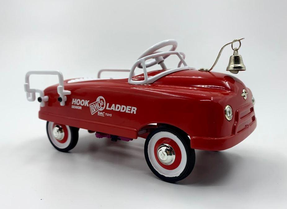 1948 BMC HOOK & LADDER PEDAL CAR. Features include working headlights and Tailights, authentic 1/6 scale die-cast metal pedal car bank replica