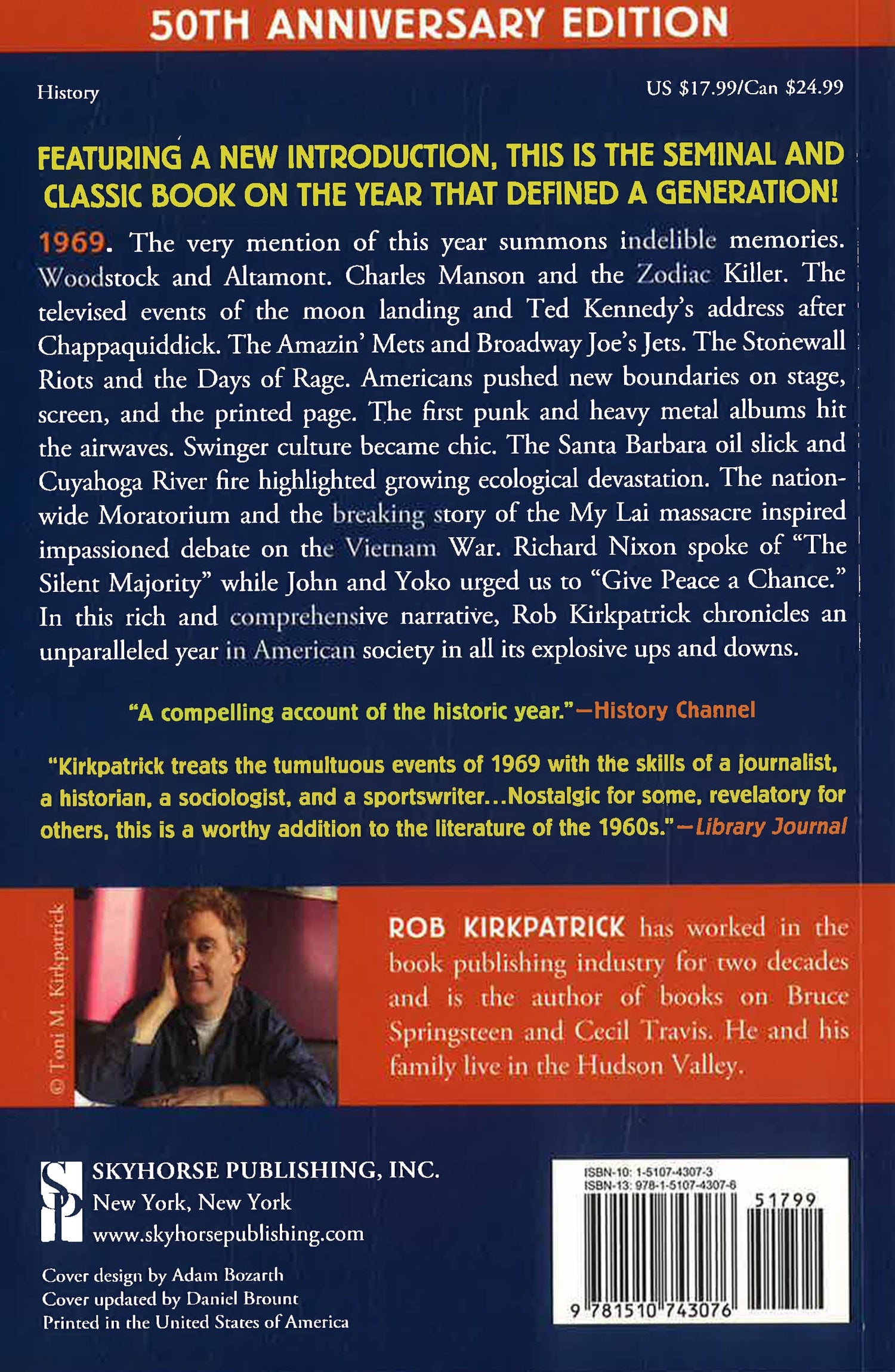 With a new introduction, and published on the 50th Anniversary of the year that defined a generation, this is the seminal and classic book on the subject. Lively and concise, here is the book that captures 1969, the year in which man landed on the moon; the “Miracle Mets” captivated sports fans; students took over college campuses and demonstrators battled police; America witnessed the Woodstock music festival; Hollywood produced Easy Rider; Kurt Vonnegut published Slaughterhouse-Five; Star Trek aired its final episode; punk music was born; and there was murder at Altamont Speedway. Joe Namath. Richard Nixon. Chappaquiddick. The Zodiac Killer. The Stonewall Riots. Tommy. Apollo 11. The Godfather. Led Zeppelin. The list goes on. Compelling, timely, and a blast to read, 1969 chronicles the year in culture and society, sports, music, film, politics, and technology. This look back at one of the most influential years in modern history is perfect for those who survived 1969 or for those who simply want to feel as though they did. Now, fifty years later, 1969 is more relevant than ever. This updated edition features a new introduction from the author that marks 1969 as a landmark year both historically and currently. In this rich and comprehensive narrative, Rob Kirkpatrick chronicles the seminal events of this unparalleled year in American society, in all its explosive ups and downs.