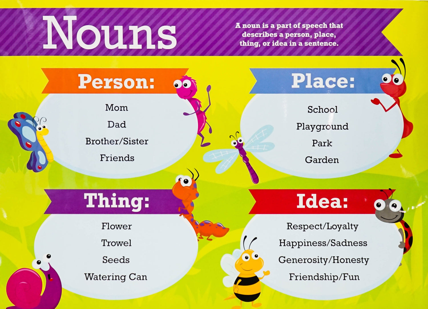 Two educational classroom wall posters double sided about nouns and verbs. The front gives examples of nouns and verbs and the back has multiple worksheets. Nice bright colors. Recommended for the 1st and 2nd Grade. These will make a great addition to your classroom. Poster measues: 49.53 x 68.58 (cm)