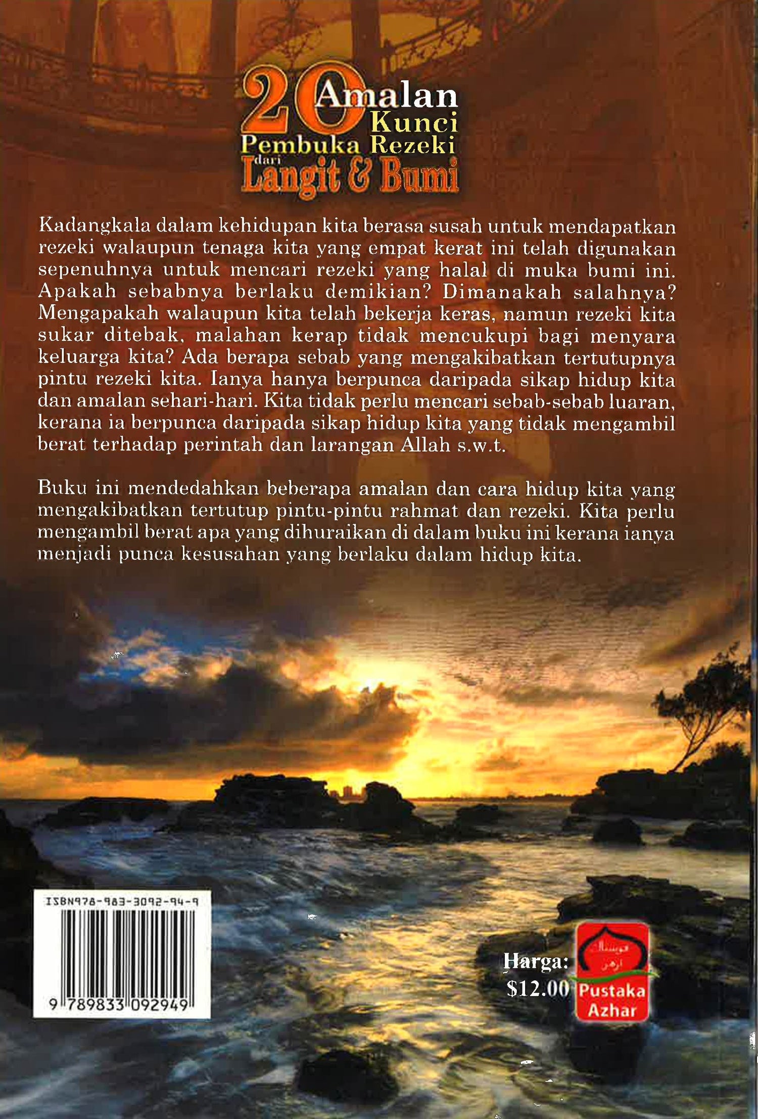 Kadangkala dalam kehidupan kita berasa susah untuk mendapatkan rezeki walaupun tenaga kita yang empat kerat ini telah digunakan sepenuhnya untuk mencari rezeki yang halal di muka bumi ini. Apakah sebabnya berlaku demikian? Dimanakah salahnya? Mengapakah walaupun kita telah bekerja keras, namun rezeki kita sukar ditebak, malahan kerap tidak mencukupi bagi menyara keluarga kita? Ada berapa sebab yang mengakibatkan tertutupnya pintu rezeki kita. Ianya hanya berpunca daripada sikap hidup kita dan amalan sehari-hari. Kita tidak perlu mencari sebab-sebab luaran, berana ia berpunca daripada sikap hidup kita yang tidak mengambil berat terhadap perintah dan larangan Allah s.w.t. Buku ini mendedahkan beberapa amalan dan cara hidup kita yang mengakibatkan tertutup pintu-pintu rahmat dan rezeki. Kita perlu mengambil berat apa yang dihuraikan di dalam buku ini kerana ianya menjadi punca kesusahan yang berlaku dalam hidup kita.