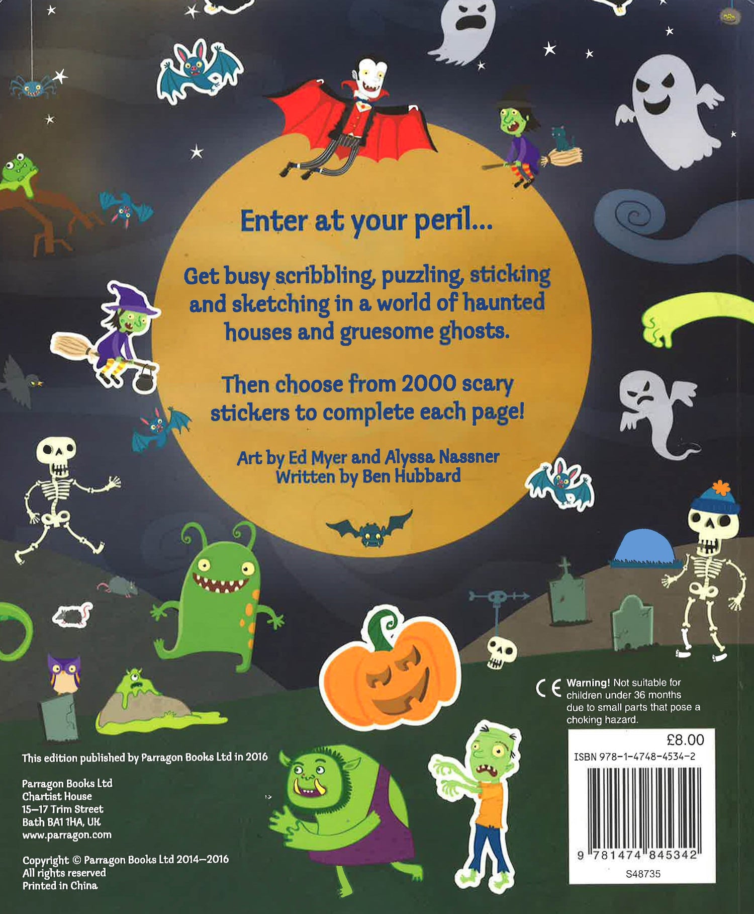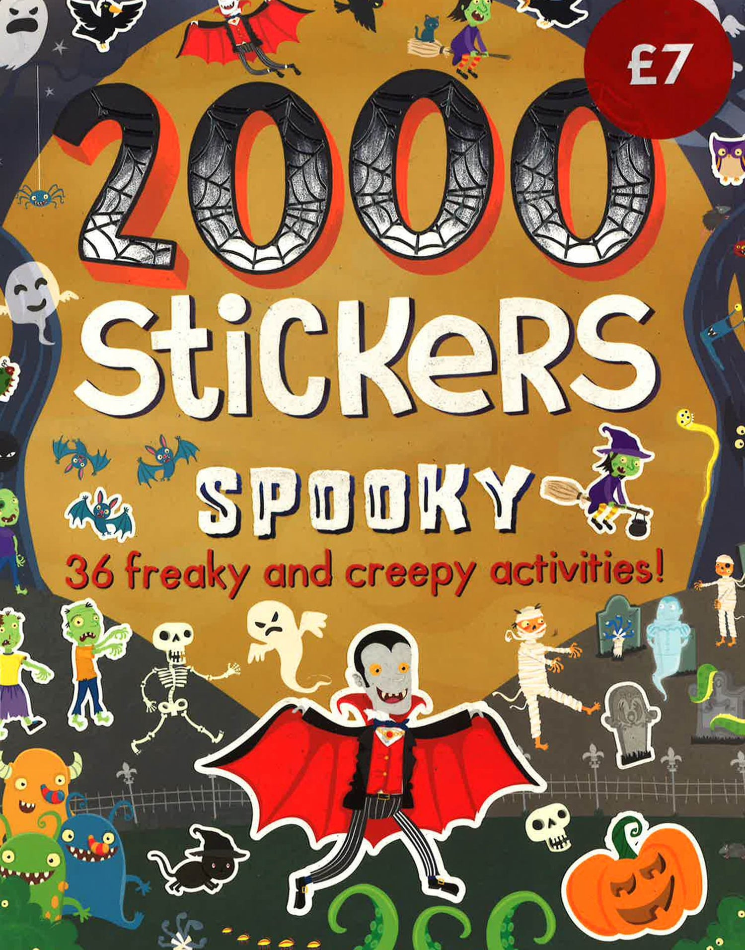 Fun sticker and activities book for Halloween. It includes 2000 various stickers plus 36 freaky and creepy activities to keep the kids occupied and having fun. Makes a great pre-Halloween gift. Perfect for long car rides, restaurant waits and more. Very cute!