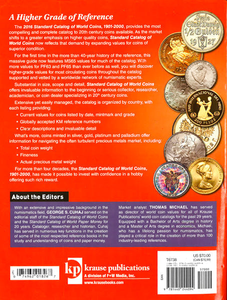 A Higher Grade of ReferenceThe "2016 Standard Catalog of World Coins, 1901-2000" provides the most compelling and complete catalog to 20th century coins available. As the market shifts to a greater emphasis on higher quality coins, "Standard Catalog of World Coins" now reflects that demand by expanding values for coins of superior condition.For the first time in the more than 40-year history of the reference, this massive guide now features MS65 values for much of the catalog With more values for PF63 and PF65 than ever before as well, you will discover higher-grade values for most circulating coins throughout the catalog supported and vetted by a worldwide network of numismatic experts.Substantial in size, scope and detail, "Standard Catalog of World Coins" offers invaluable information to the beginning or serious collector, researcher, academician, or coin dealer specializing in 20th century coins.Extensive yet easily managed, the catalog is organized by country, with each listing providing: Current values for coins listed by date, mintmark and gradeGlobally accepted KM reference numbersClear descriptions and invaluable detailWhat's more, coins minted in silver, gold, platinum and palladium offer information for navigating the often turbulent precious metals market, including: Total coin weightFinenessActual precious metal weightFor more than four decades, the "Standard Catalog of World Coins, 1901-2000" has made it possible to invest with confidence in a hobby offering such a rich reward.