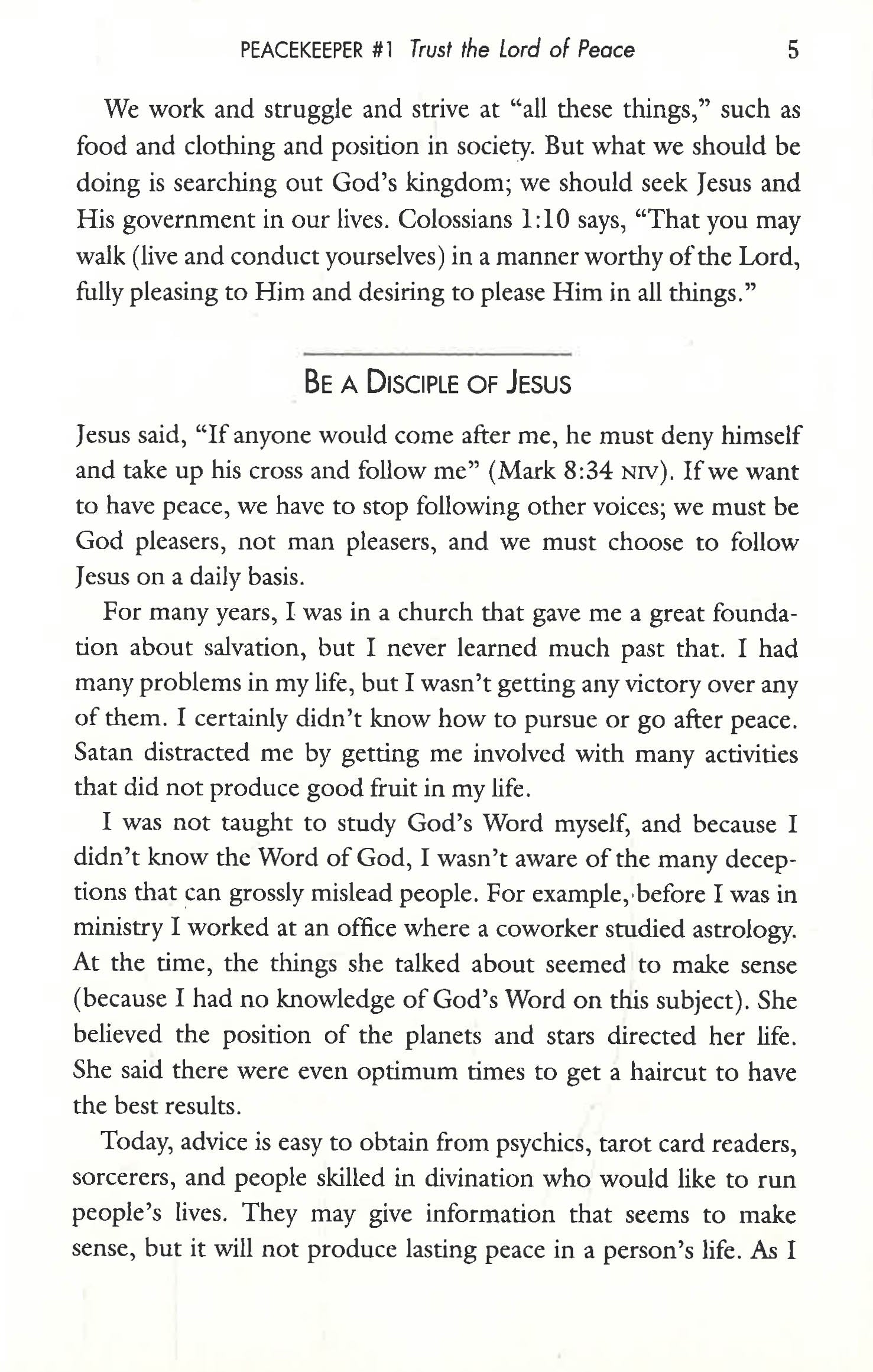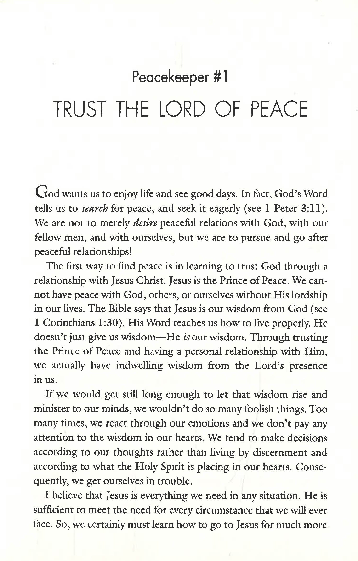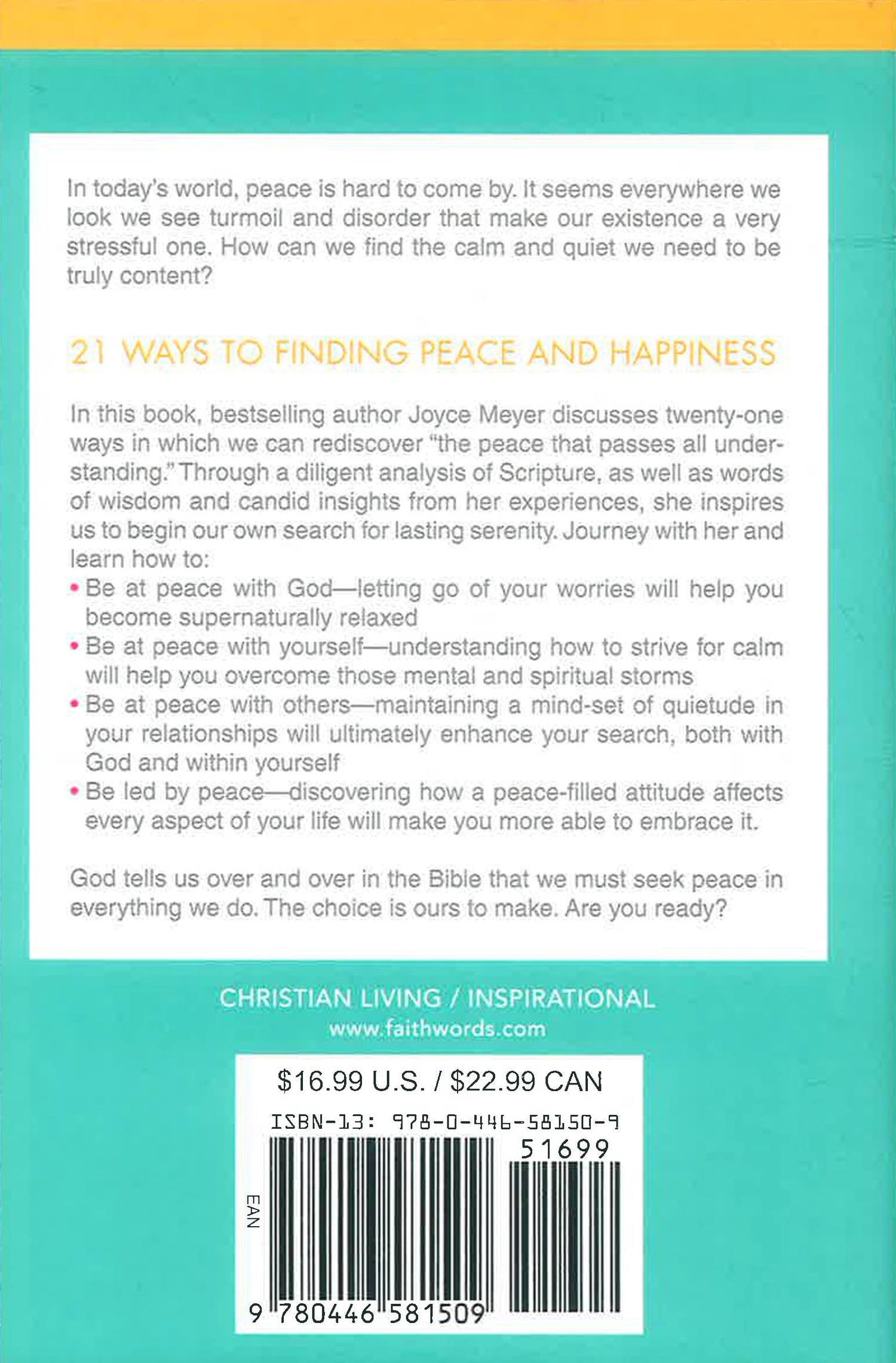 Peace is a priority for God, and therefore, it should be a priority for us as well. Indeed, we are instructed to seek peace with others. But in today's world, tranquility is hard to come by. If we don't have it ourselves, seeking it with others is an impossible task. How do we find peace? As Joyce Meyer explains, by submitting our will to God. When we follow our own desires, we forfeit serenity; but, by obeying God's guidance, we ensure ourselves peace-filled living. Maintaining peace is a choice. We are given the keys to a peaceful life, but must choose to live in and follow that peace. If we are not actively seeking God's will, we will walk in anxiety and dissension and ultimately become ineffective. For when we lose our compass, we lose our direction. In this book, Joyce Meyer discusses the pursuit of true peace--from how to be at peace with yourself and the importance of having peace with God to enjoying peaceful relationships, being led by peace, developing a peaceful attitude, and the paradox that peace equals power.