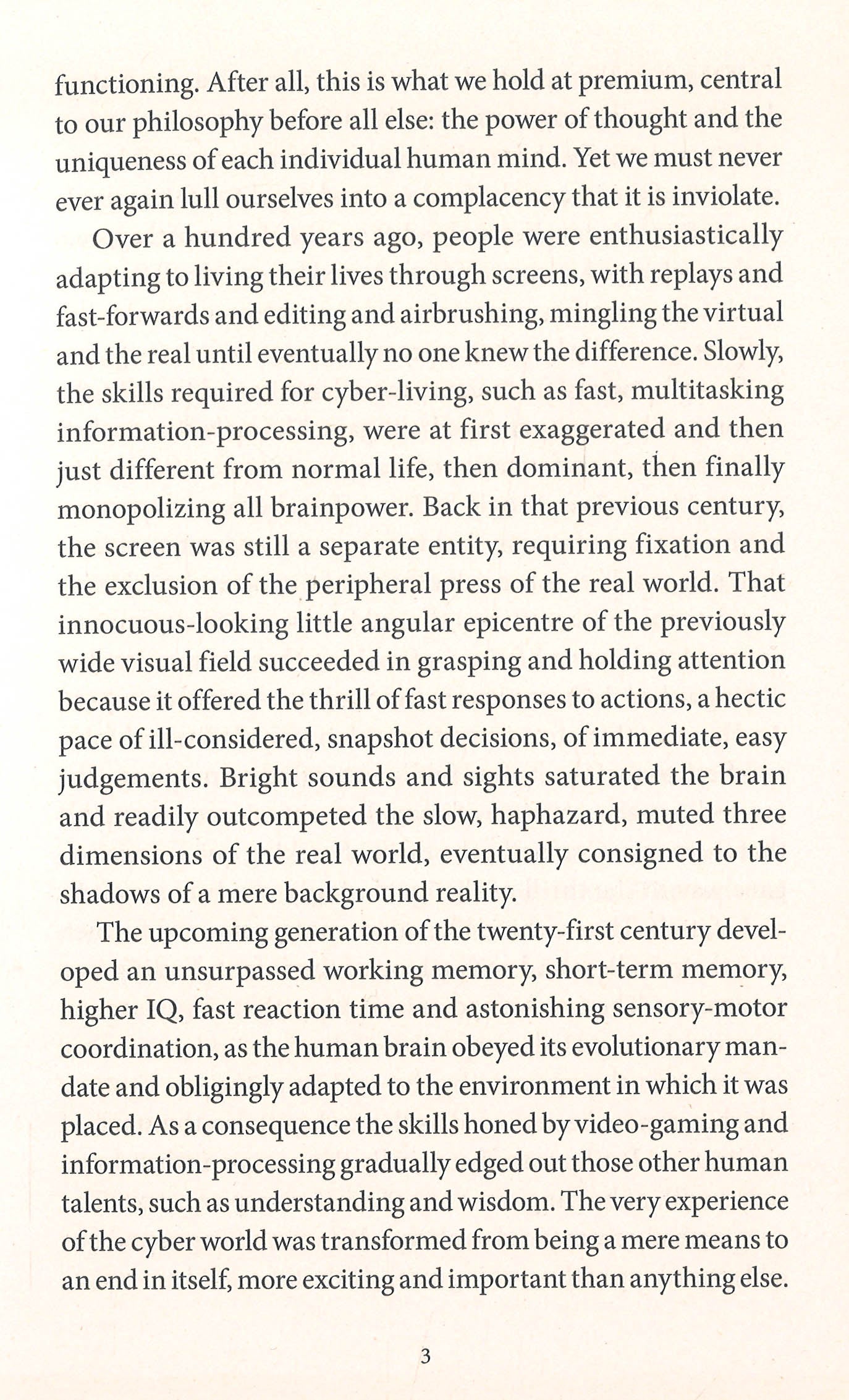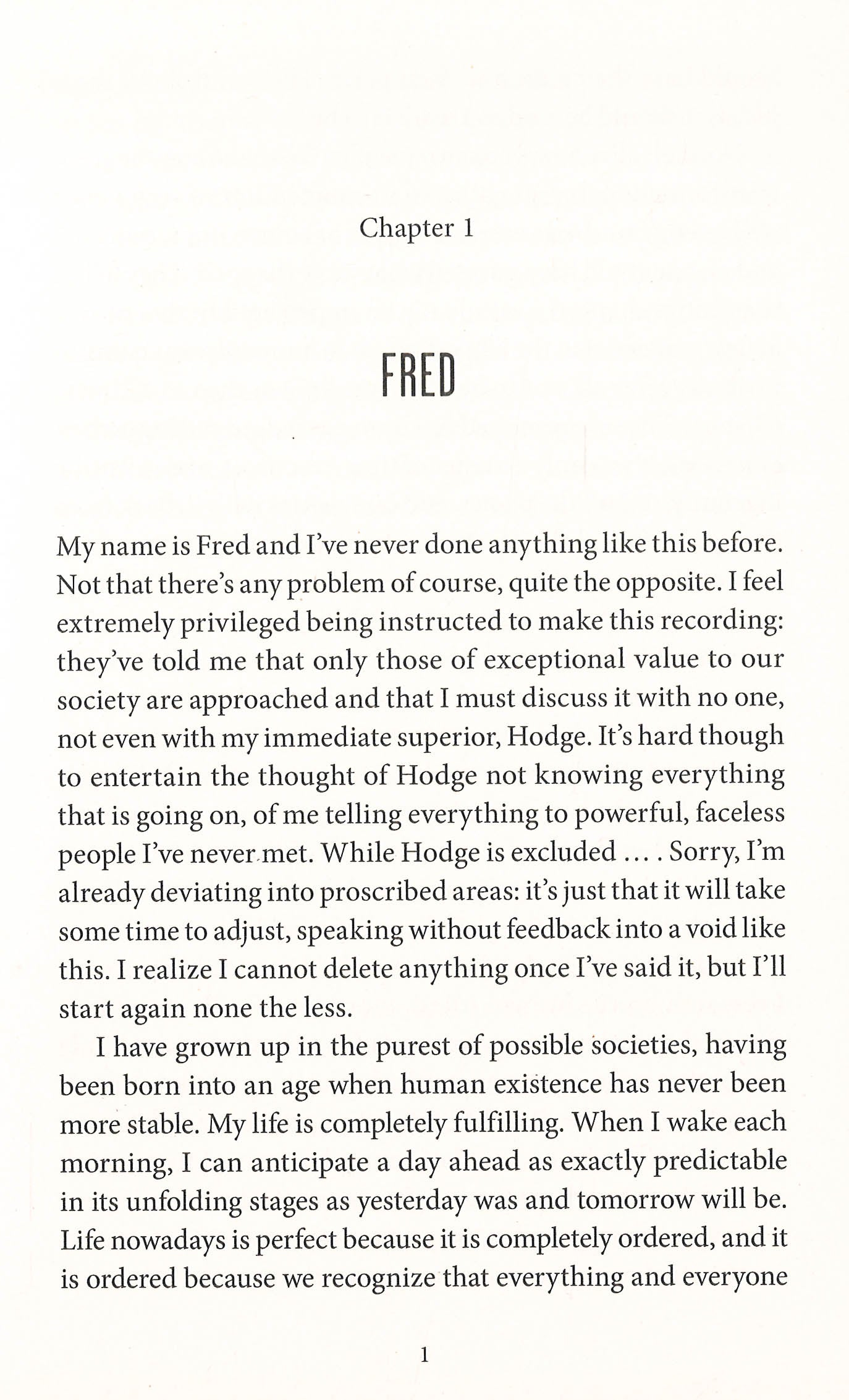 It is many years since the human race gave up its individuality. Our world is now a place of technicolour, mechanical beauty. Iridescent domes sit upon the ruins of the previous civilization, and small figures wander constantly between them - dancing, singing, running, but never touching. Each of us is immersed in our own virtual reality. We are like children, living in a perpetual summer: ageless, beautiful, and utterly reliant on the lost knowledge of another age. For decades, nothing disturbed our peaceful equilibrium. Until Fred arrived. Until he took one of us from among from us and made her different. Until he showed us what our world was made of.
