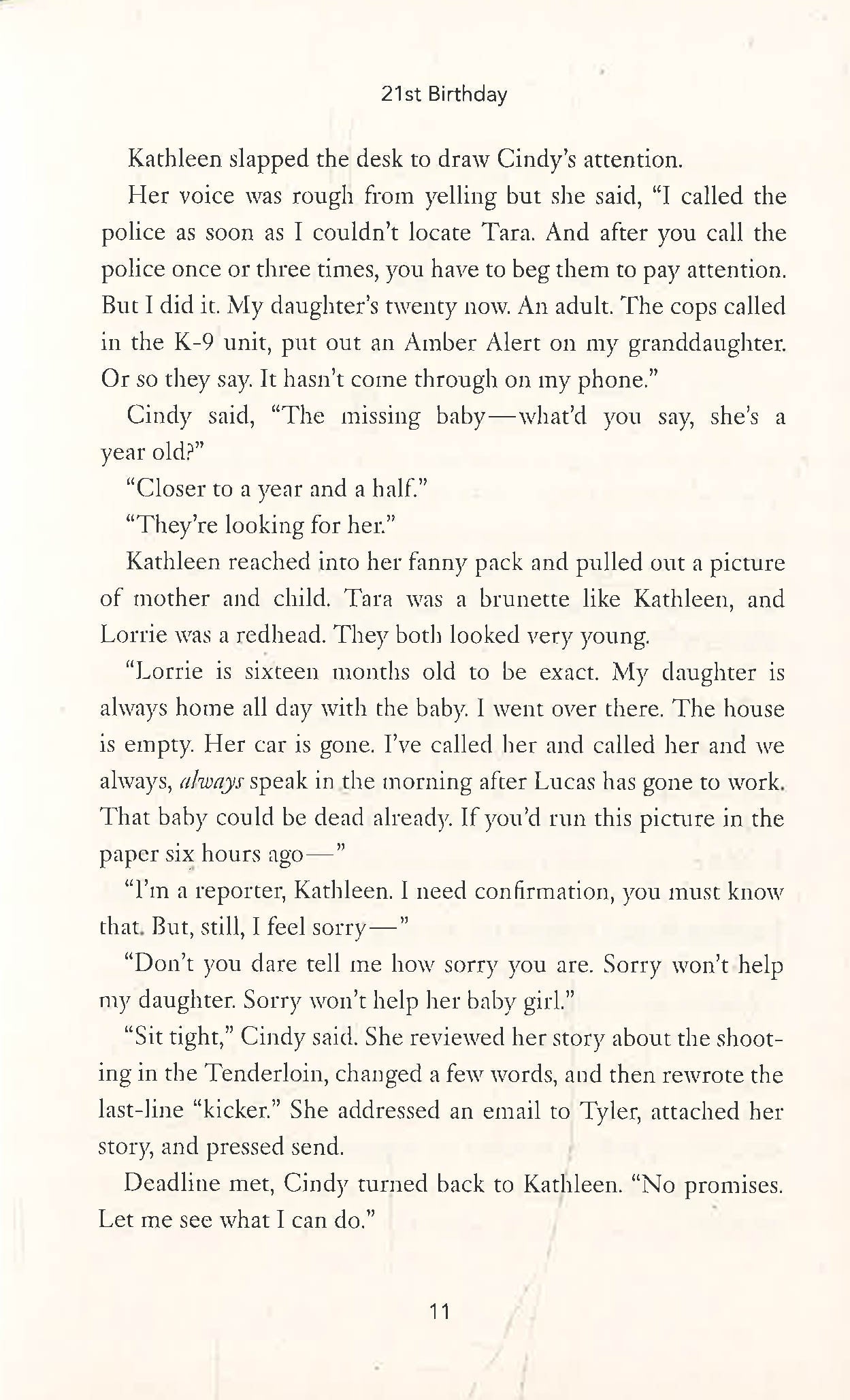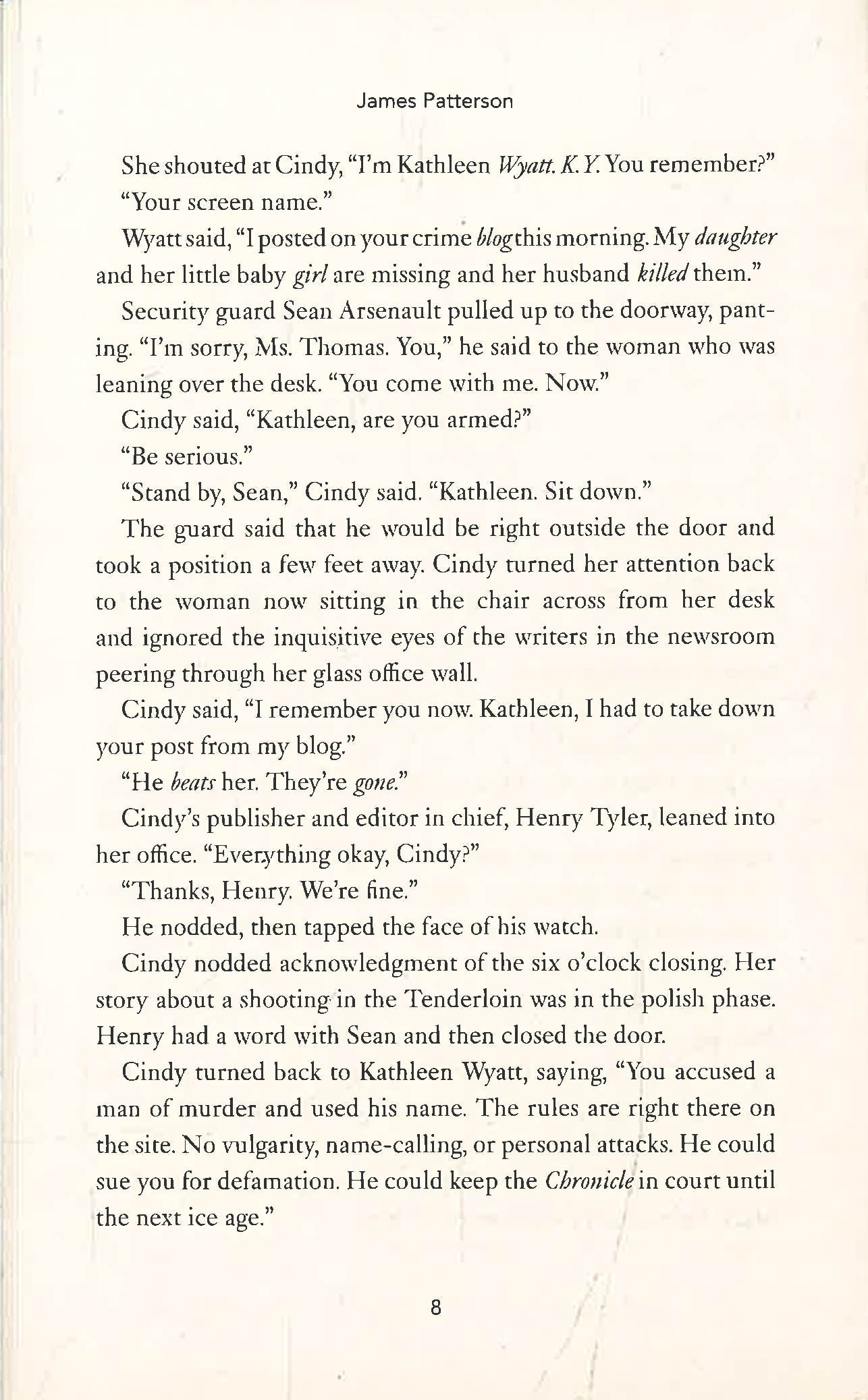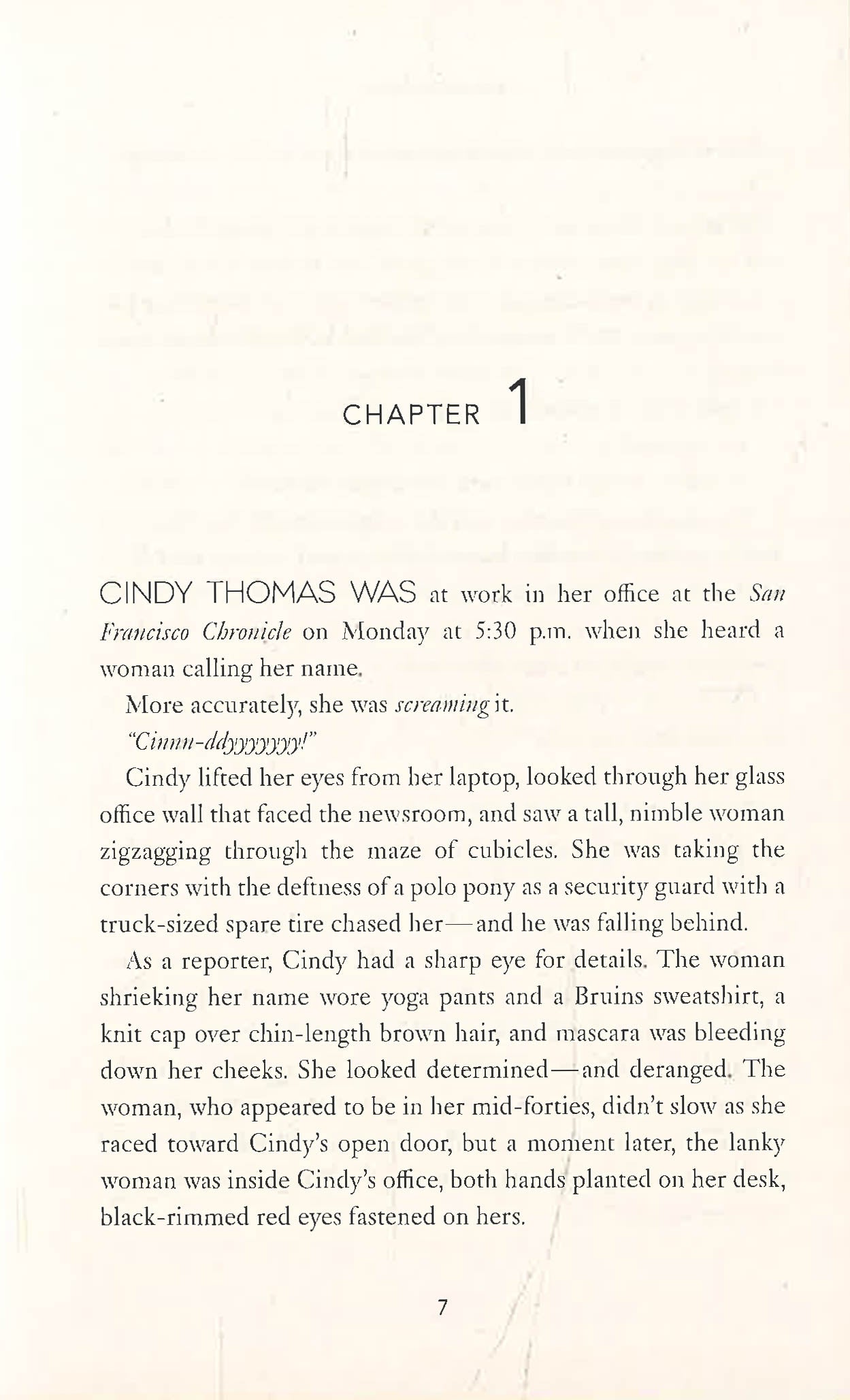 When young wife and mother Tara Burke goes missing with her baby girl, all eyes are on her husband, Lucas. He paints her not as a missing person but a wayward wife--until a gruesome piece of evidence turns the investigation criminal.While Chronicle reporter Cindy Thomas pursues the story and M.E. Claire Washburn harbors theories that run counter to the SFPD's, ADA Yuki Castellano sizes Lucas up as a textbook domestic offender . . . who suddenly puts forward an unexpected suspect. If what Lucas tells law enforcement has even a grain of truth, there isn't a woman in the state of California who's safe from the reach of an unspeakable threat.