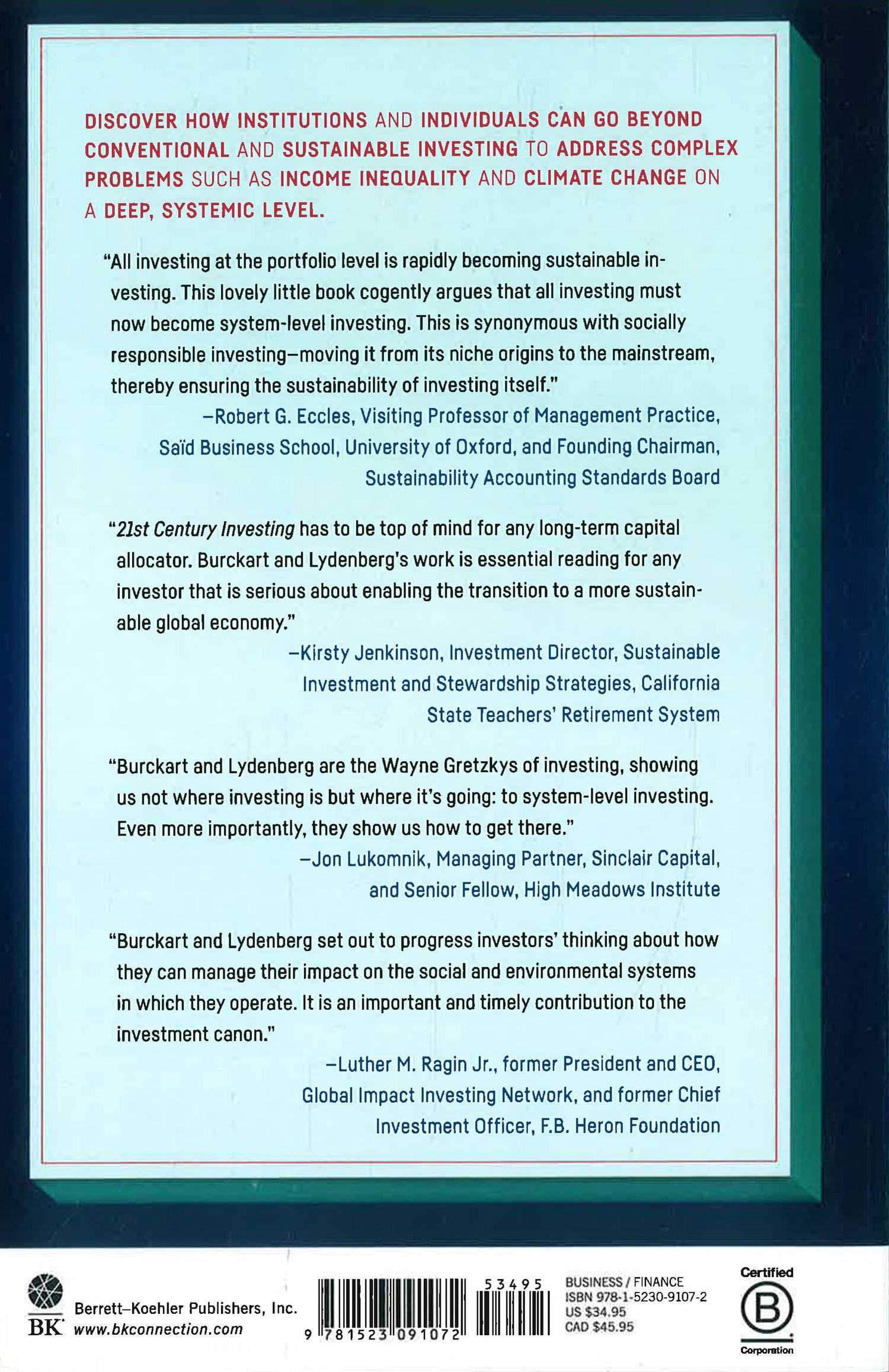 This book is for those investors who believe in that transition. They may be institutions, large or small, concerned about the long-term stability of the environment and society. They may be individual investors who want their children and grandchildren to inherit a just and sustainable world. Whoever they may be, Burckart and Lydenberg show them the what, why, and how of system-level investment in this book: what it means to manage system-level risks and rewards, why it is imperative to do so now, and how to integrate this new way of thinking into their current practice.