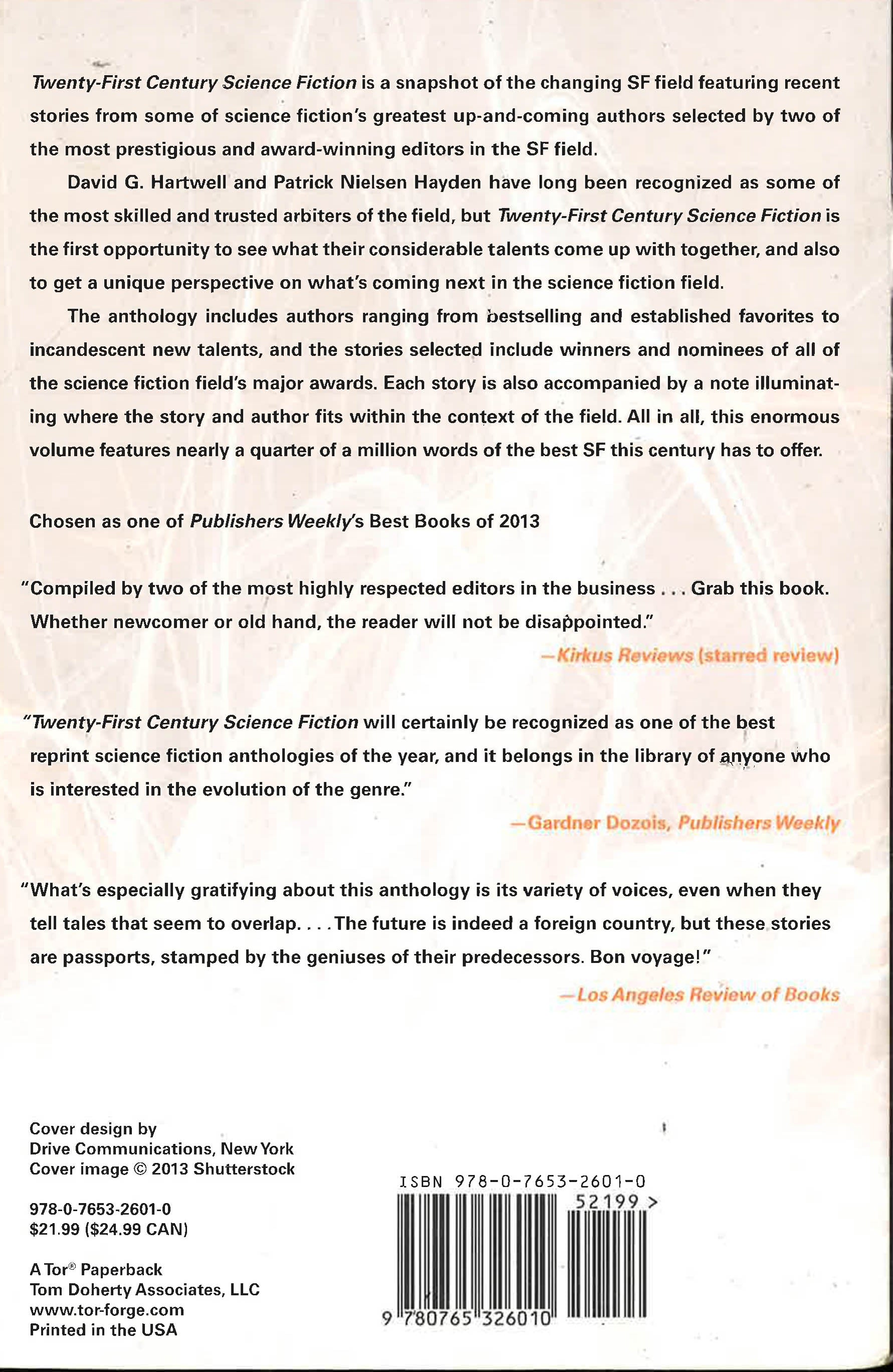 Twenty-First Century Science Fiction is an enormous anthology - close to 250,000 words - edited by two of the most prestigious and award-winning editors in the SF field and featuring recent stories from some of science fiction's greatest up-and-coming authors. David Hartwell and Patrick Nielsen Hayden have long been recognized as two of the most skilled and trusted arbiters of the field, but Twenty-First Century Science Fiction presents fans' first opportunities to see what their considerable talents come up with together, and also to get a unique perspective on what's coming next in the science fiction field. The anthology includes authors ranging from bestselling and established favorites to incandescent new talents including Paolo Bacigalupi, Cory Doctorow, Catherynne M. Valente, John Scalzi, Jo Walton, Charles Stross, Elizabeth Bear, and Peter Watts, and the stories selected include winners and nominees of all of the science fiction field's major awards.