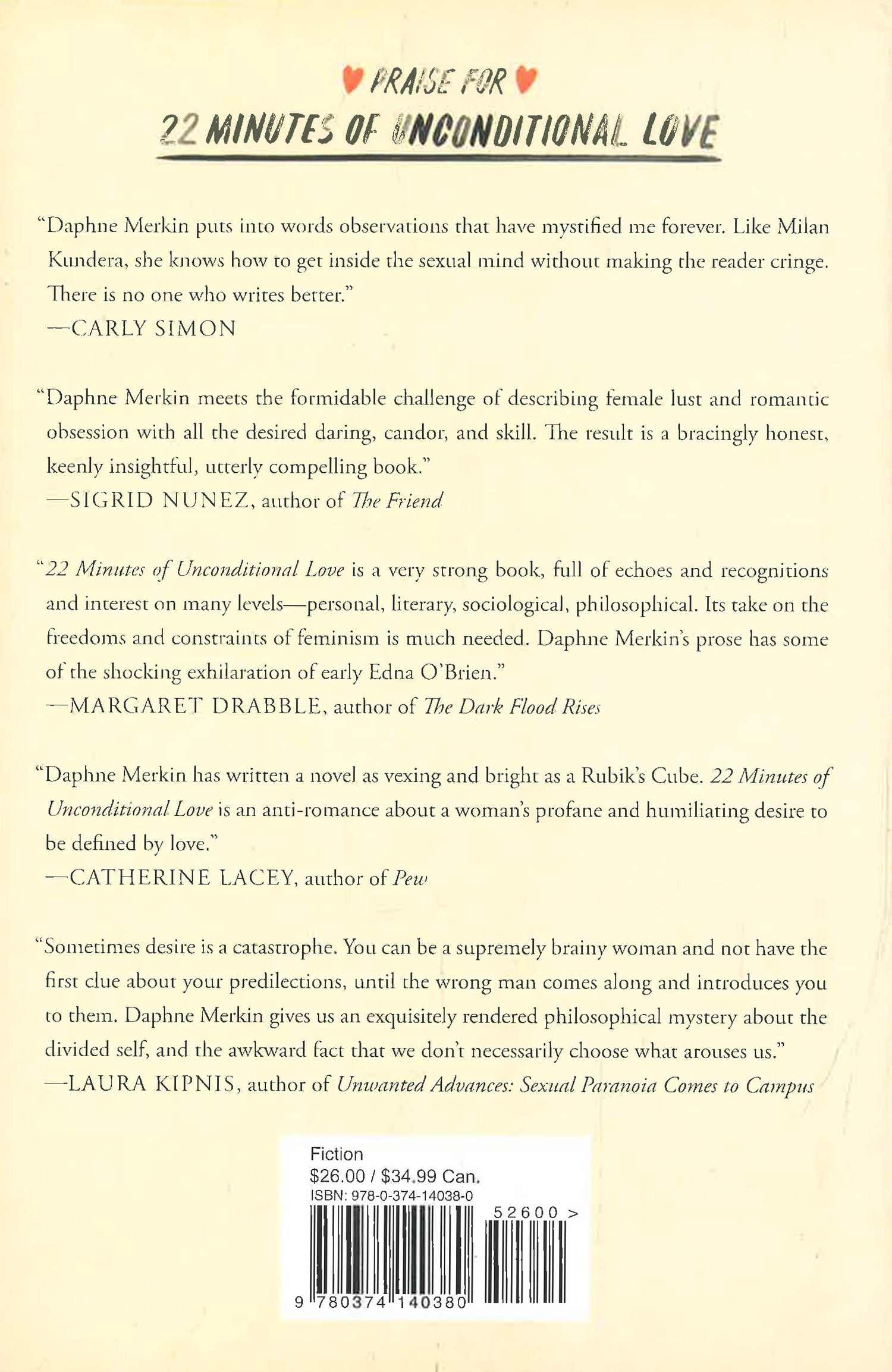A novel of unsurpassed candor, punctuated by bold ruminations on love, marriage, family, sex, gender, and relationships, 22 Minutes of Unconditional Love depicts one woman’s psychological descent into sexual captivity. This is the story of the extremes to which she will go to achieve erotic bliss―and of her struggle to regain her soul.