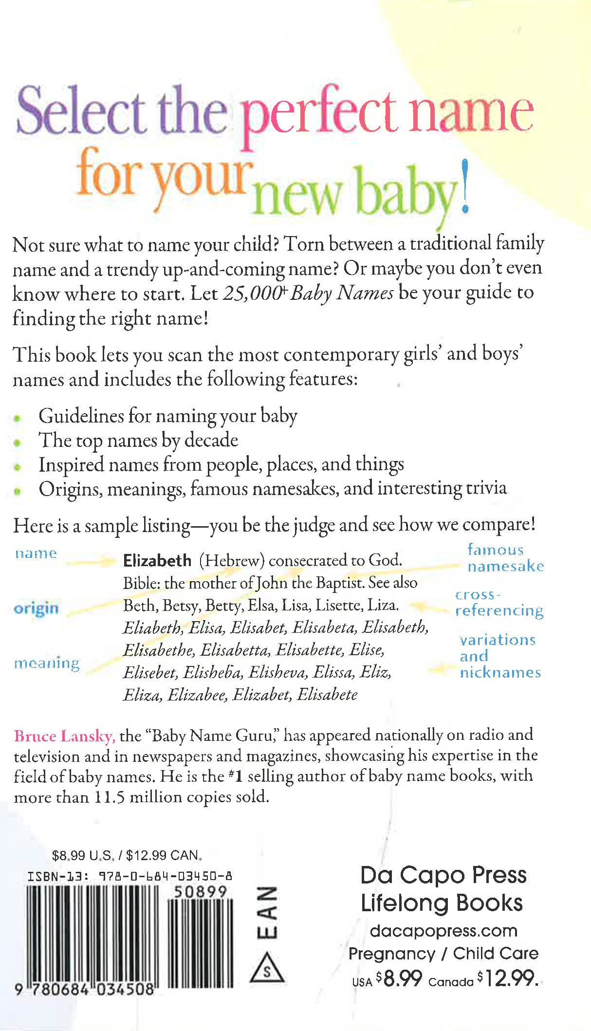 Let 25,000+ Baby Names be your guide to finding the right name! This book lets you easily scan boys' and girls' names and includes features like: guidelines for naming your baby, popular names from around the world, origins, meanings, famous namesakes, and interesting name trivia.