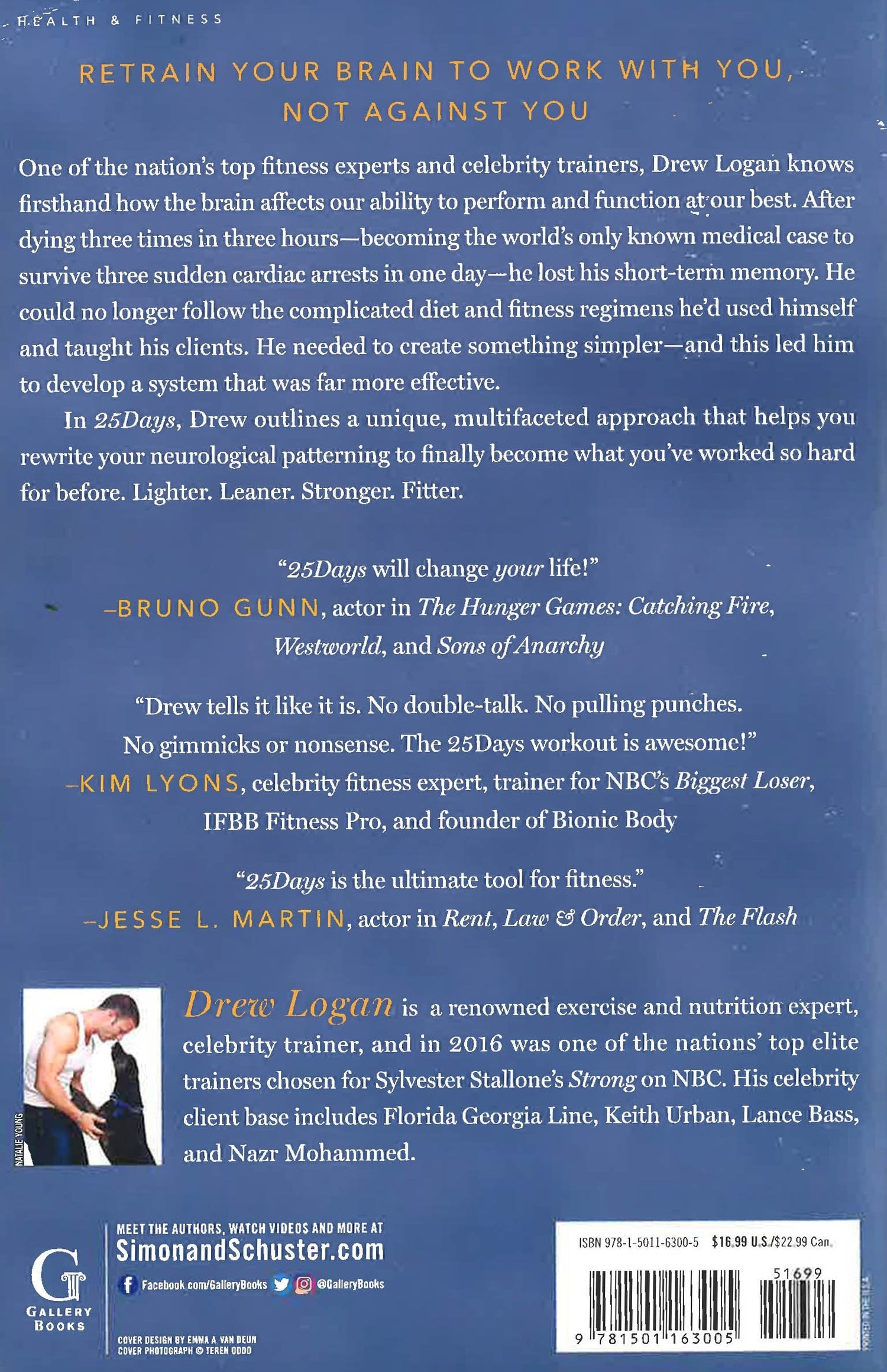 Celebrity trainer and cast member of NBC’s Strong, Drew Logan shows us how to rewrite our neurological patterns and break the habits that prevent us from losing weight and living a healthy life.Celebrity trainer and cast member of NBC’s Strong, Drew Logan knows firsthand how the brain affects our ability to perform and function at our best. After dying three times in three hours—becoming the world’s only known medical case to survive three sudden cardiac arrests—he lost his short-term memory. He could no longer follow the complicated diet and fitness regimens he’d used on himself and his clients. He needed to create something simpler. He was shocked to discover that the resulting program was even more effective than his complicated regime of the past.In 25 Days, Drew outlines a unique, multifaceted approach that helps you rewrite your neurological patterning—what lies underneath those pesky habits that get in our way over and over again—so that the brain’s neural pathways, biochemistry, and hormones work together effectively, seamlessly, and efficiently. Included in the book are the 25 Days Grading System, Diet, and Workout Plan, as well as tools that will alert and assist readers throughout the book.