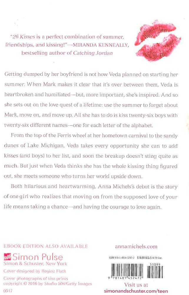 Kasie West meets Morgan Matson in this hilarious and heartwarming debut about a girl's summer mission to get over her ex-boyfriend by kissing her way through the alphabet. Getting dumped by her boyfriend is not how Veda planned on starting her summer. When Mark makes it clear that it's over between them, Veda is heartbroken and humiliated--but, more importantly, she's inspired. So she sets out on the love quest of a lifetime: use the summer to forget about Mark, to move on, and move up. All she has to do is kiss twenty-six boys with twenty-six different names--one for each letter of the alphabet. From the top of the Ferris wheel at her hometown carnival to the sandy dunes of Lake Michigan, Veda takes every opportunity she can to add kisses (and boys) to her list, and soon the break-up doesn't sting quite as much. But just when Veda thinks she has the whole kissing thing figured out, she meets someone who turns her world upside down.