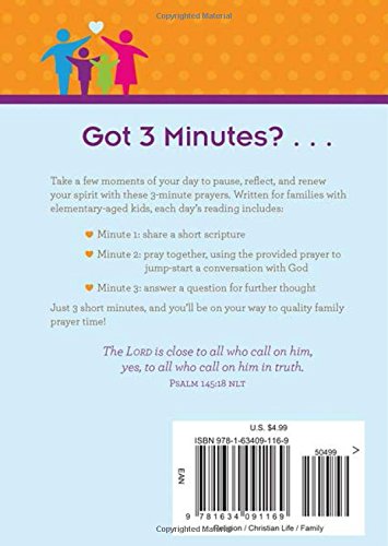 Got 3 minutes? . . . Families will find just the inspiration they need for family time in 3-Minute Prayers for Families. This practical book packs a powerful dose of inspiration into 3 short minutes. Minute 1: scripture to share; Minute 2: a just-right-sized devotional prayer; Minute 3: a simple discussion question to apply the prayer to everyone in the family. Each day’s prayer meets readers right where they are and is a great way for families to begin or end their day. 3-Minute Prayers for Families is an ideal inspirational gift for parents and kids ages 4-10.