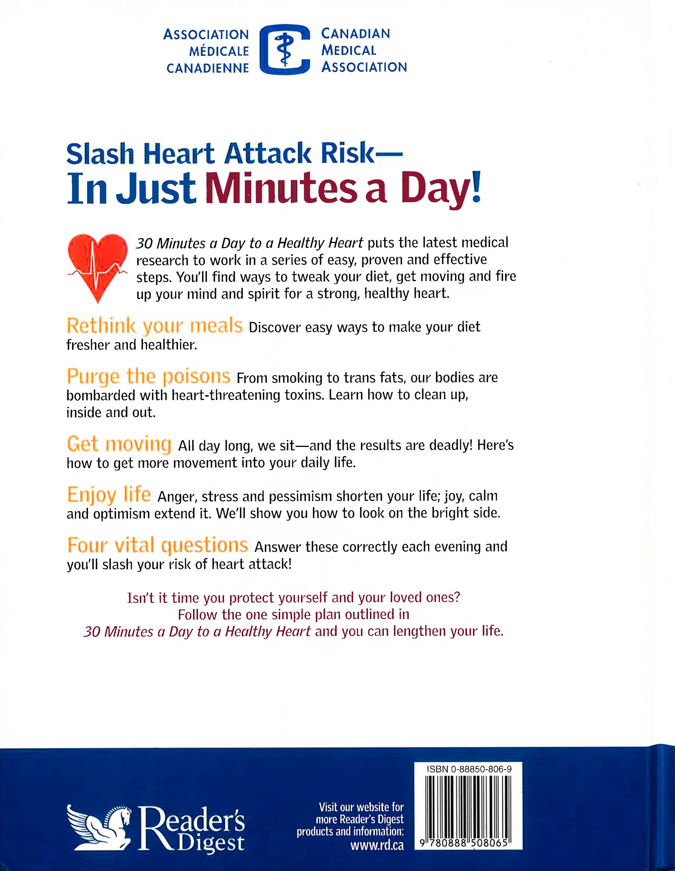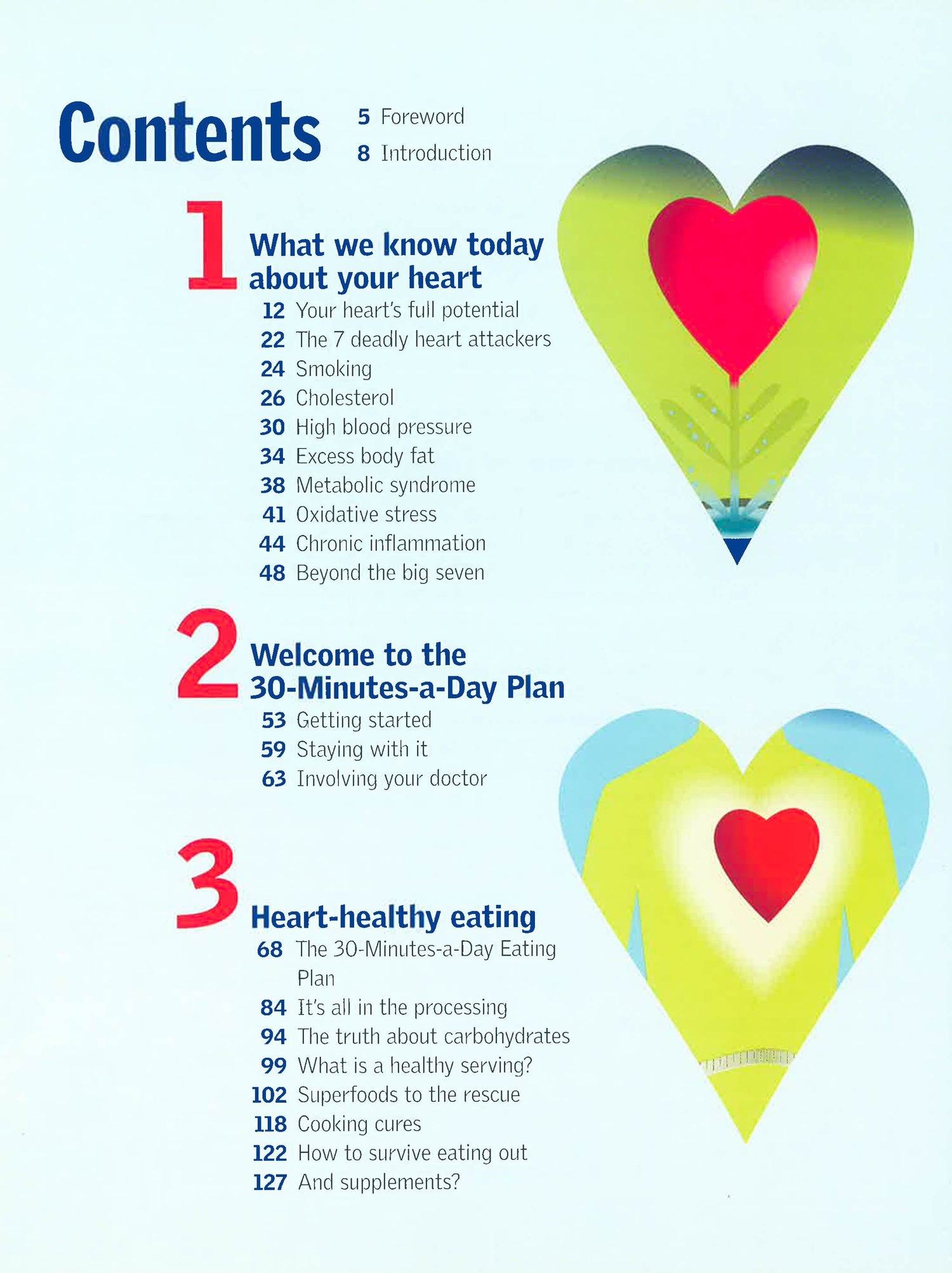 30 Minutes a Day to a Healthy Heart puts the latest medical research to work in a siries of easy ,proven and effective steps.You'll find ways to tweak your diet ,get moving and fire up your mind and spirit for a strong .healthy heart