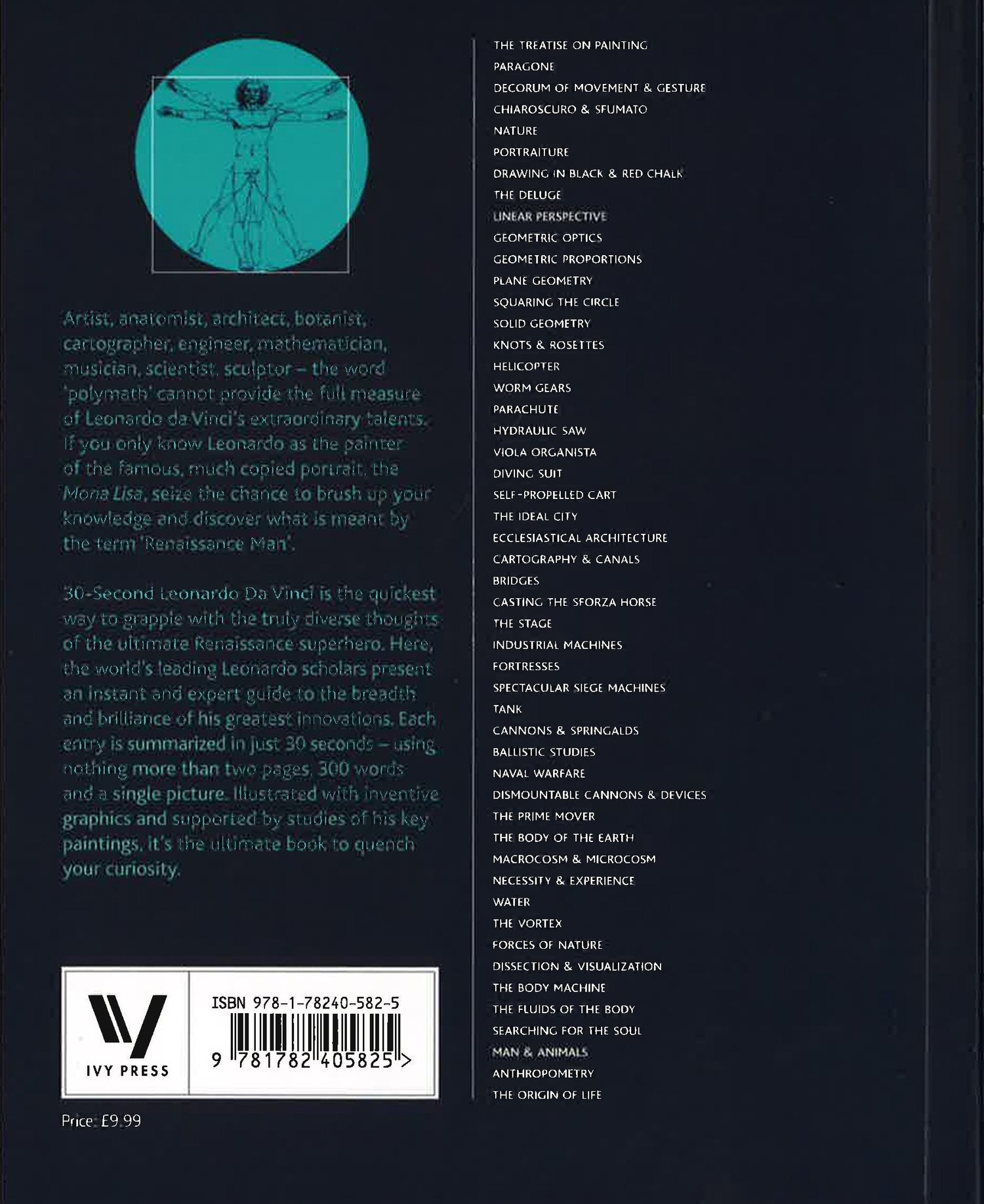 The bestselling 30-Second... series takes a revolutionary approach to learning about those subjects you feel you should really understand. Each title selects a popular topic and dissects it into the 50 most significant ideas at its heart. Every idea, no matter how complex, is explained in 300 words and one picture, all digestible in 30 seconds. 30-Second Leonardo da Vinci uses this unique approach to grapple with the truly diverse thoughts of the ultimate Renaissance Man. Artist, anatomist, sculptor, inventor, architect, cartographer, mathematician, musician, botanist, geologist the word polymath does not quite do Leonardo justice. The painter of the Mona Lisa and conceptualizer of the helicopter seems like a Renaissance superhero. Here, the world's leading Leonardo scholars present an instant and expert guide to the breadth and brilliance of his greatest innovations.