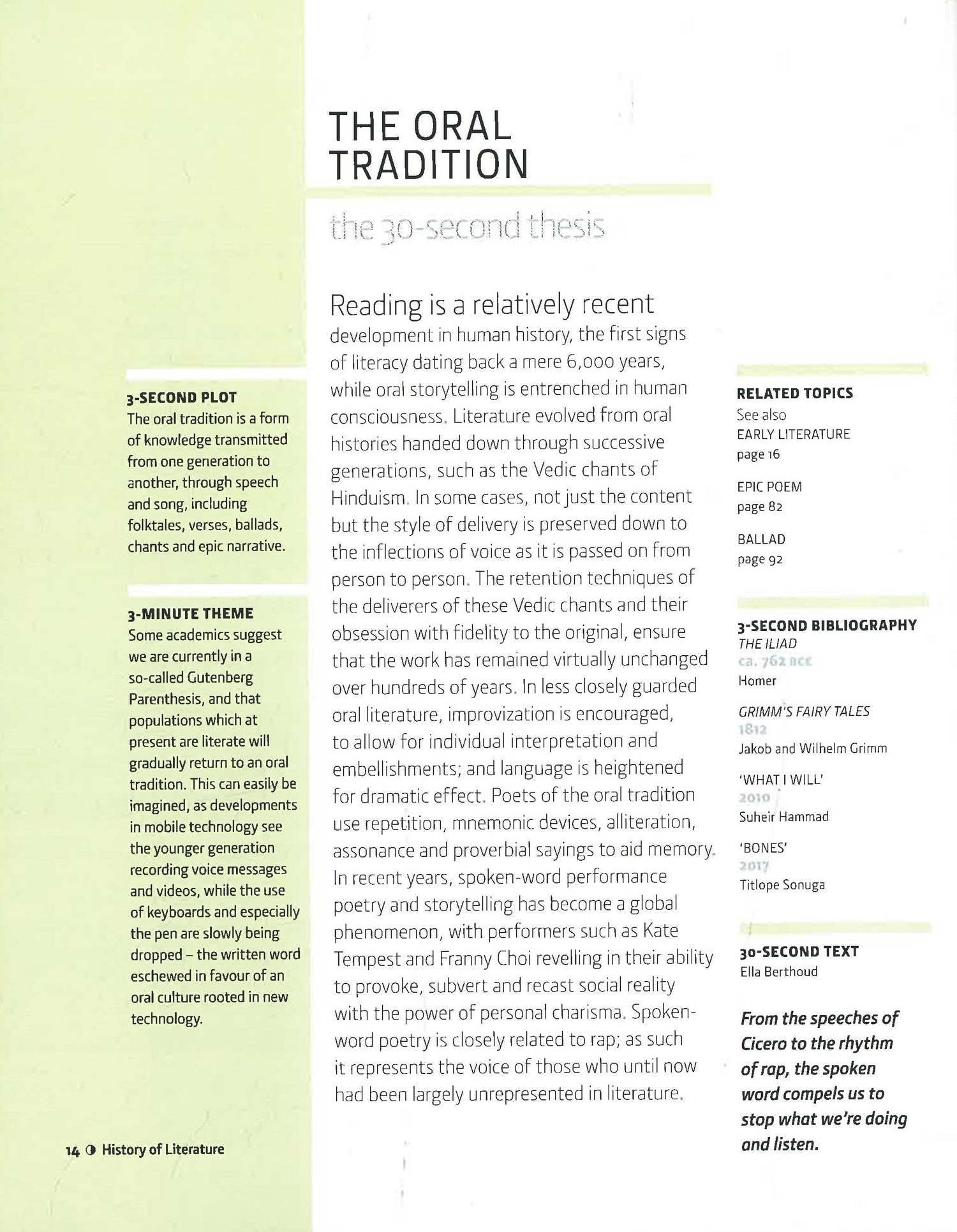 Whether you're looking for a new author or genre to explore, 30-Second Literature provides you with an introduction to the major literary genres, styles and histories. Part of the best-selling 30-Second series, this introductory guide to literature is split into 7 chapters. Learn about: The History of Literature - from Sanskrit to ModernismThe Novel - in all its glorious genresLiterary Prose - non-fiction from diaries to philosophiesPoetry - from the sonnet to the haikuDrama - interesting theatrical forms and genresLiterary Devices - the techniques authors use in their worksLiterary Styles - the features and history of different styles of writing Each topic is simply summarised in 300 words and contains a small bibliography for you to expand your bookworm horizons. You can also brush up on literary terms ahead of that book-club meeting, as each chapter features its own glossary. Interspersed throughout the book are profiles of key literary figures that have impacted one of our most beloved hobbies. Literature is not just any written work; it is work that has stood the test of time, that is most widely thought to be of lasting merit. Just how particular books are elevated to literary status, reflects the values and judgements of society and mirrors the development of civilisation. This book is a broad overview of the multitude of voices used to describe our human experience, perfect for beginners, new students, and lifelong lovers of Literature. If you like this, you might also be interested in 30-Second Mythology, 30-Second Numbers or any of the other title sin the 30 Second series!