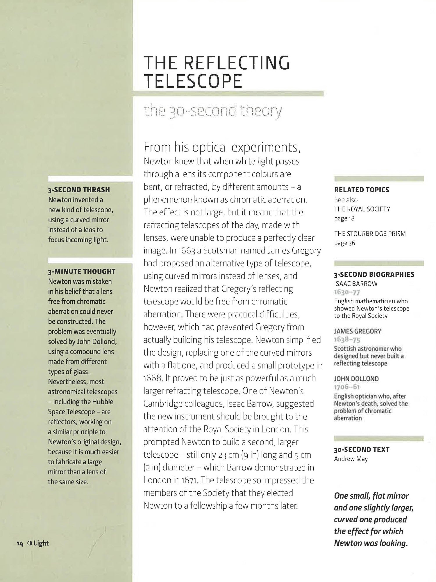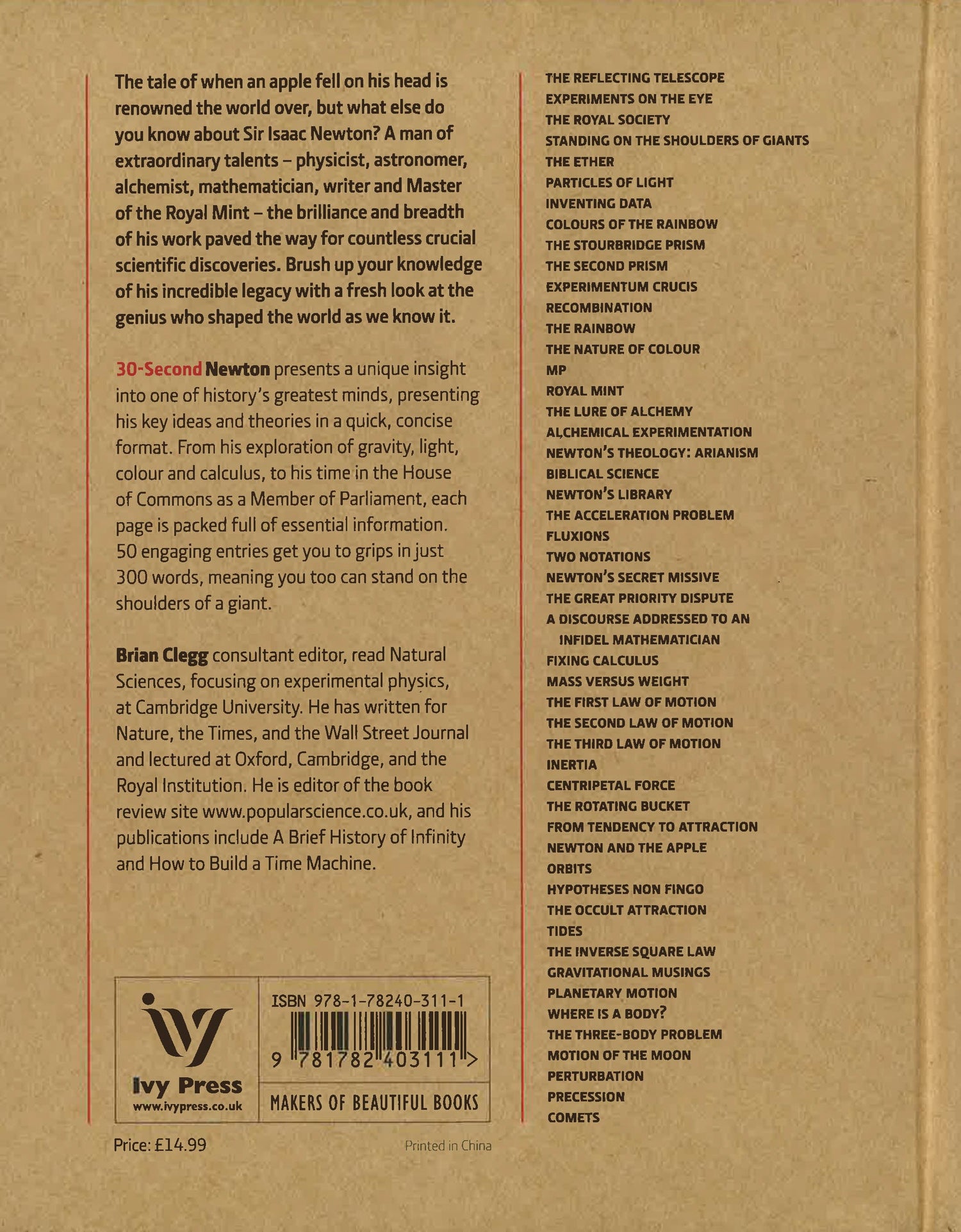 Not only a towering figure in his own era, Newton also left an immense scientific legacy, much of which still underpins key theories today. So if the principal thing you remember about him is that an apple fell on his head, its high time you learned a little more. 30-Second Newton offers a fast-track understanding of the key theories that formed the core of Newtons thinking, and looks at the roles he played over his long life, and at the network of connections he forged with his contemporaries. A team of expert authors assess his breadth and brilliance, offering the reader not only succinct analyses of his work on gravity, light, colour, and calculus, but also a broader picture of the key role he plays in the history of science