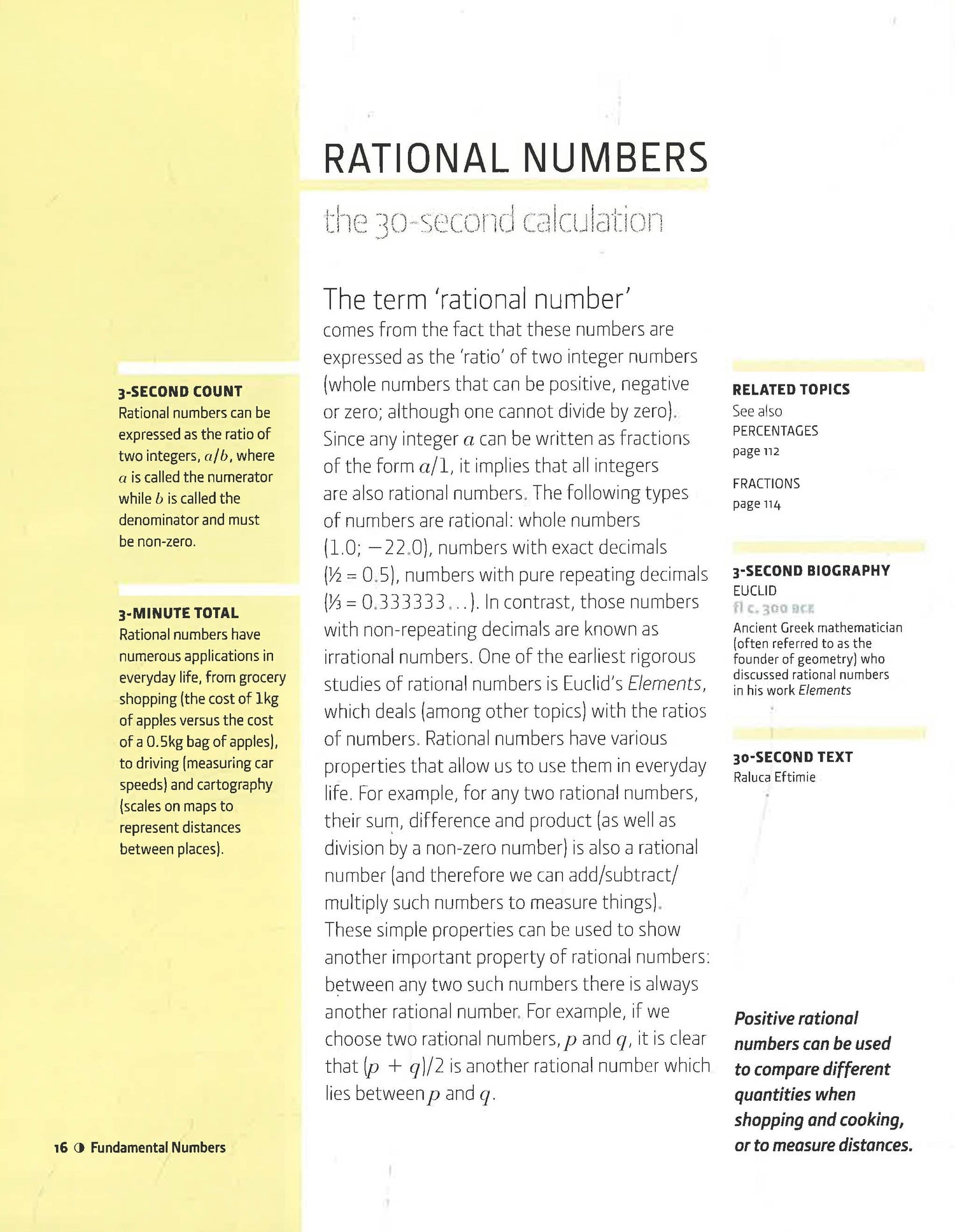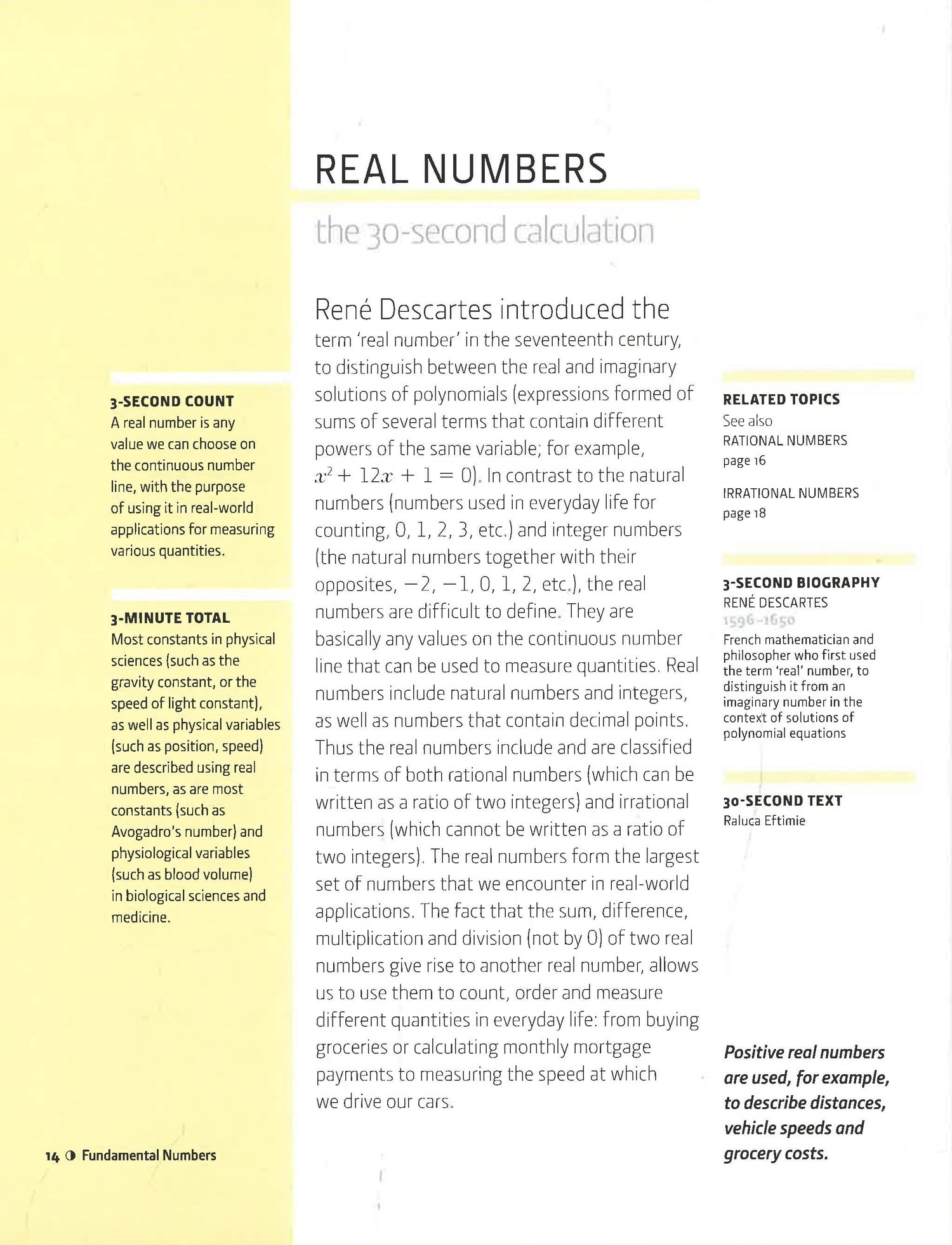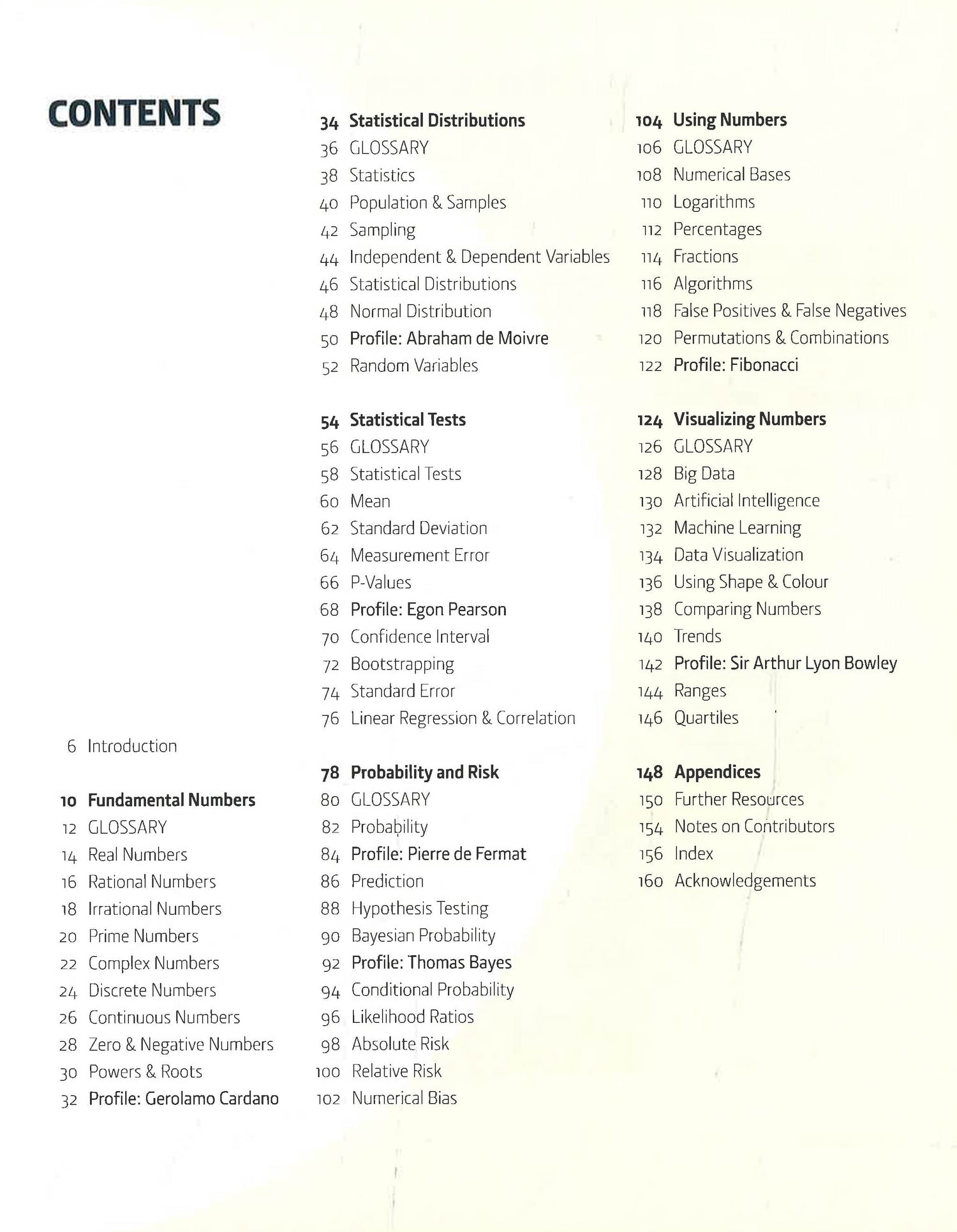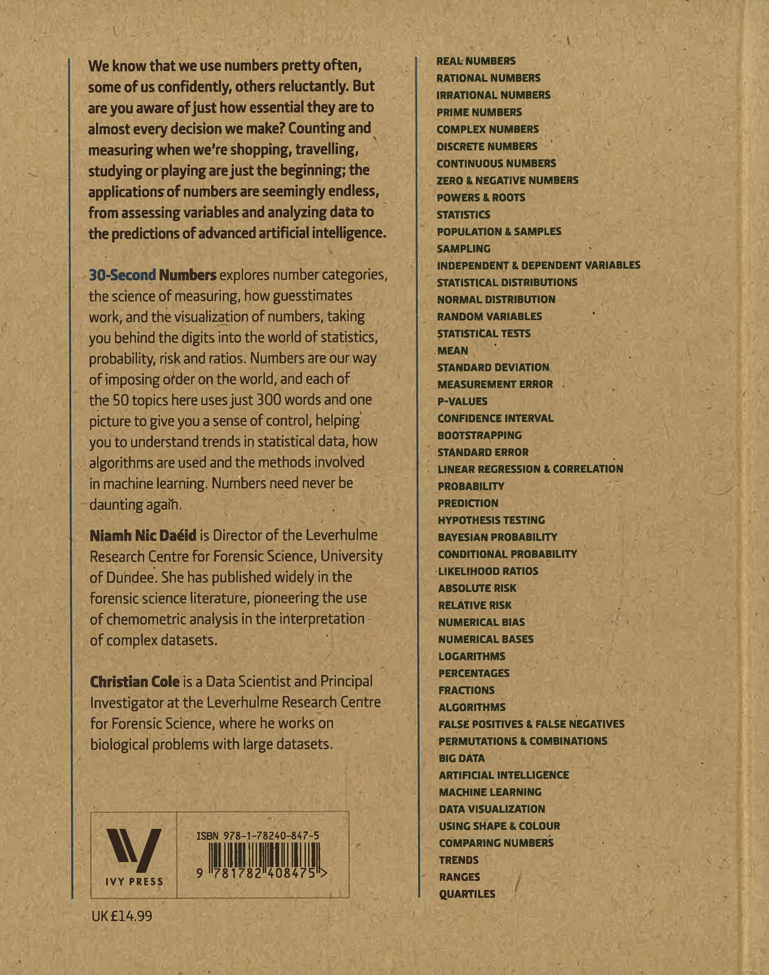 The successful 30-Second series tackles numbers, with experts on maths and data demystifying the essential numerical topics. We know that we use numbers pretty often, some of us confidently, others reluctantly. But are we aware of just how essential they are to almost every decision we make? Counting and measuring when we're shopping, travelling, studying or playing are just the beginning; the applications of numbers are endless, from assessing variables and analysing data to the calculations and predictions of advanced artificial intelligence.30-Second Numbers exploresnumber categories,the science of measuring, how guesstimates work, and the visualisation of numbers, taking you behind the digits into the world of statistics, probability, risk and ratios.Sections include: Fundamental Numbers - A guide to the different kinds of basic numbers, from rational to prime, complex to continuous. Statistical Variations and Tests - Samples, populations and random variables are all explored in this section on all things stats! Probability and Risk - Learn about prediction and hypothesis testing, as well as absolute and relative risk. Visualising numbers - From numerical bias to logarithms and algorithms, this section shows us all the different ways we can visualise numbers. Using Numbers - Big data, artificial intelligence and machine learning are all covered in this section, about how these concepts are applied in the real world.Numbers are our way of imposing order on the world, and each of the 50 topics here uses just 300 words and one picture to give you a sense of control, helping you to understand trends in statistical data, how algorithms are used and the methods involved in machine learning. In addition, each section contains a profile of a famous mathematician whose work has greatly contributed to how we understand numbers today, from Fibonacci to Pierre de Fermat.With this book, numbers need never be daunting again. The 30 Second series is a handy collection of quick guides which explain the key aspects of core subjects, from numbers to literature to art to Ancient China to biology, and lots more! These titles use only 300 words to explore each section within a topic, making them quick and digestible for those looking to learn a lot, fast!