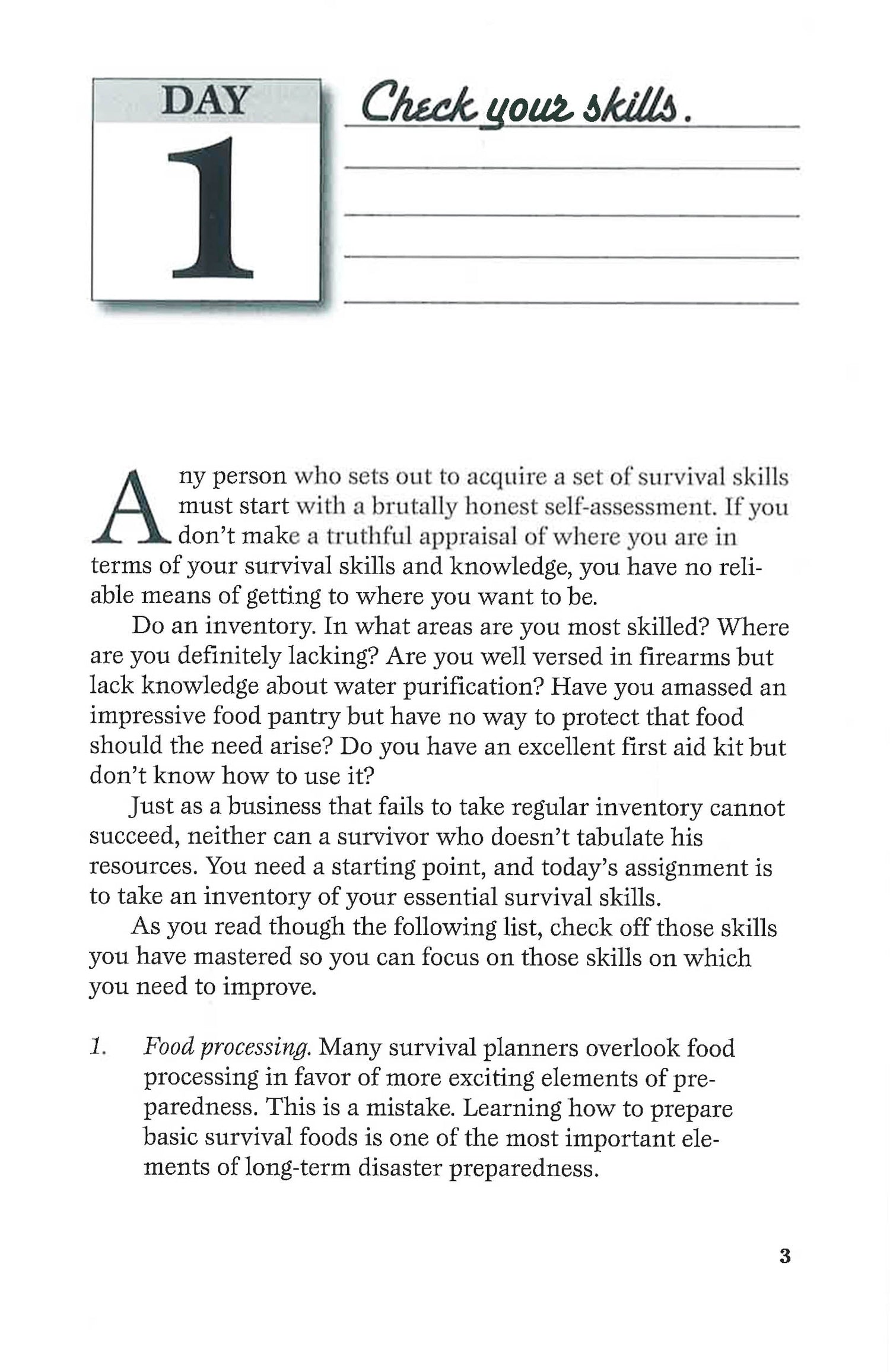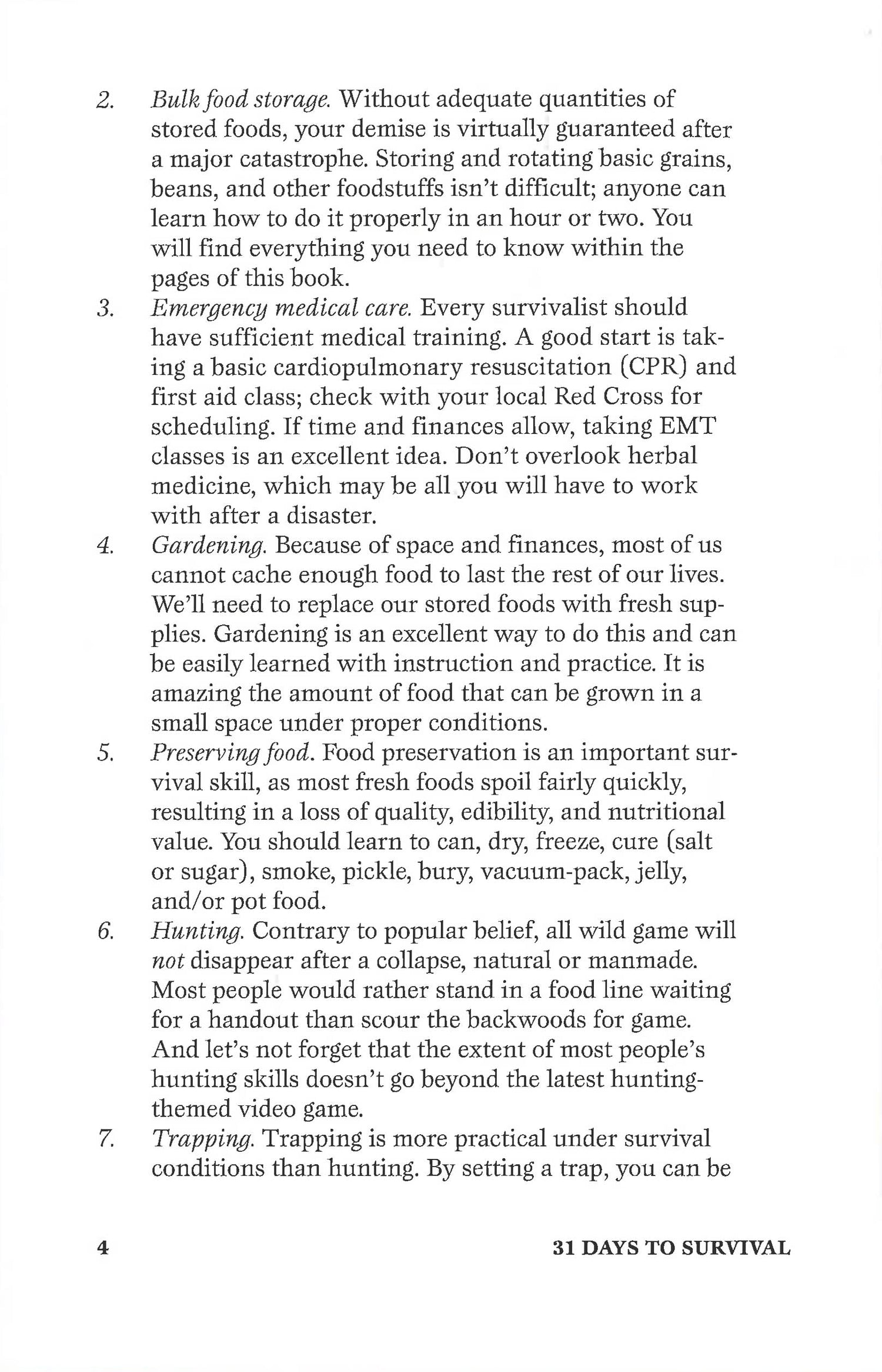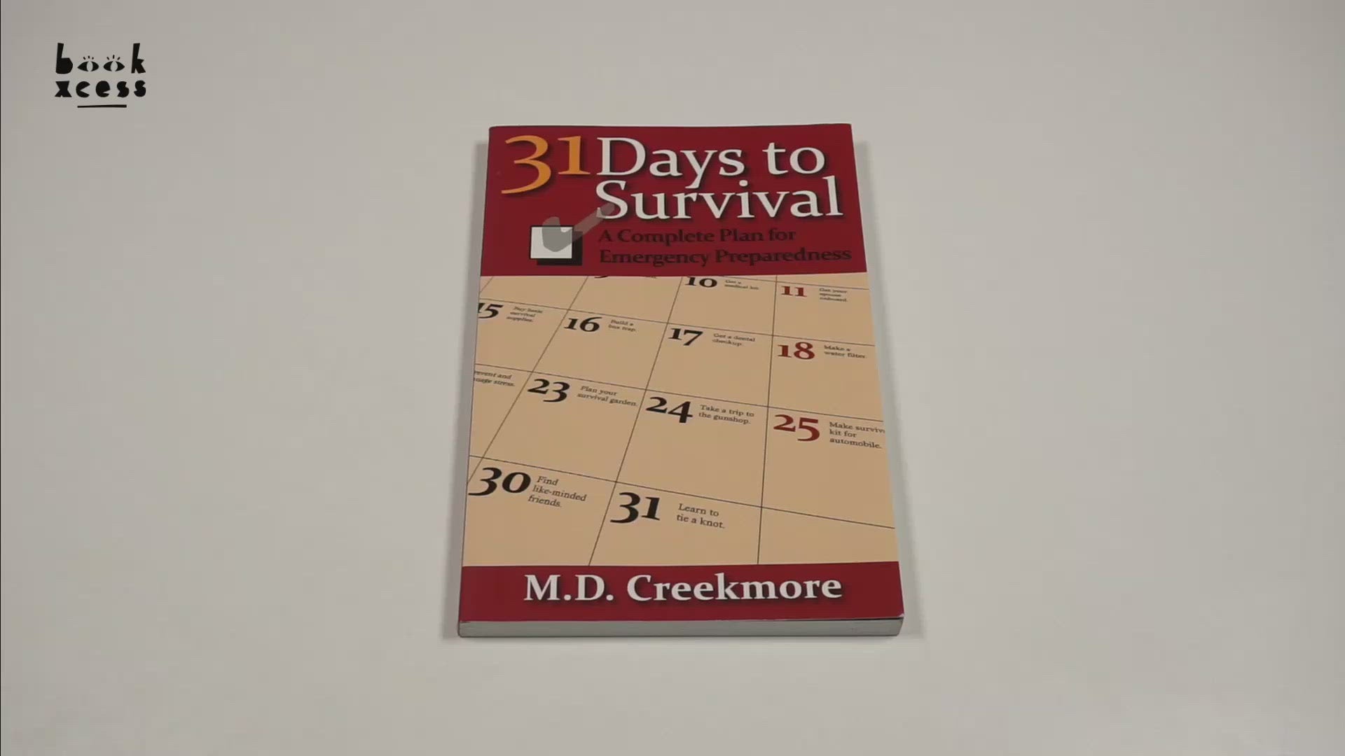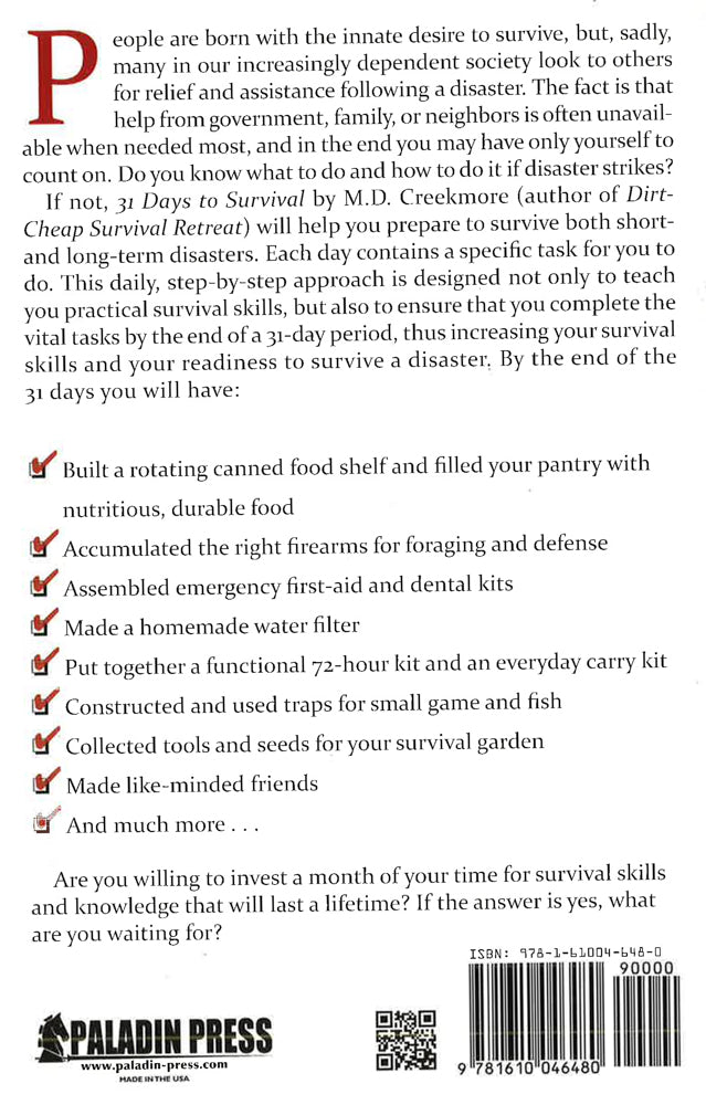 People are born with the innate desire to survive, but sadly, many in our increasingly dependent society look to others for relief and assistance following a disaster. The fact is that help from government, family, or neighbors is often unavailable when needed most, and in the end you may have only yourself to count on. Do you know what to do and how to do it if disaster strikes? If not, 31 Days to Survival by M. D. Creekmore will help you prepare to survive both short- and long-term disasters. Each day contains a specific task for you to do. This daily, step-by-step approach is designed not only to teach you practical survival skills, but also to ensure that you complete the vital tasks by the end of 31-day period, thus increasing your survival skills and your readiness to survive a long-term disaster. By the end of the 31 days you will have:*Built a rotating canned food shelf and filled your pantry with nutritious, durable food *Accumulated the right firearms for foraging and defense *Assembled emergency first-aid and dental kits *Made a homemade water filter *Put together a functional 72-hour kit and an everyday carry kit *Constructed and used traps for small game and fish *Collected tools and seeds for your survival garden *Made like-minded friends *And much more . . . Are you willing to invest a month of your time for survival skills and knowledge that will last a lifetime? If the answer is yes, what are you waiting for?
