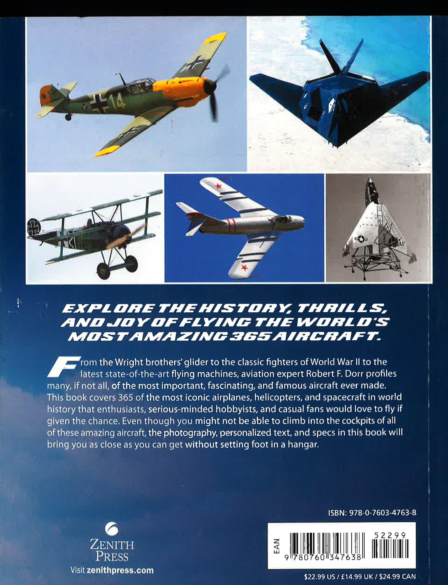 A fascinating, entertaining, and amusing plane-by-plane journey through aviation history. Aviation has come a long way since the Wright Brothers built their glider in Kitty Hawk, North Carolina, in 1903. From among the thousands of different types of military and commercial aircraft constructed over the past 100 years, aviation expert Robert F. Dorr profiles the most important, fascinating, and famous aircraft ever made. Your opinions might differ, but you wouldn't want to miss out on the planes Dorr identifies as flights of a lifetime. The book covers 365 of the most iconic aircraft in world history that enthusiasts, serious-minded hobbyists, and casual fans would love to fly if given the chance. Clear photography, historical context, and specs get you as close as possible to these planes without setting foot in a hangar. While covering every era of aviation history, many of the planes in 365 Aircraft You Must Fly were flown during World War II, a time unmatched in aviation for its technological advances, romance, and clarity of purpose. During this golden age of flying, propellers gave way to jet engines, and the "Greatest Generation" fought gallantly in them. Explore the history, thrills, and joy of flying the world's most amazing 365 aircraft.