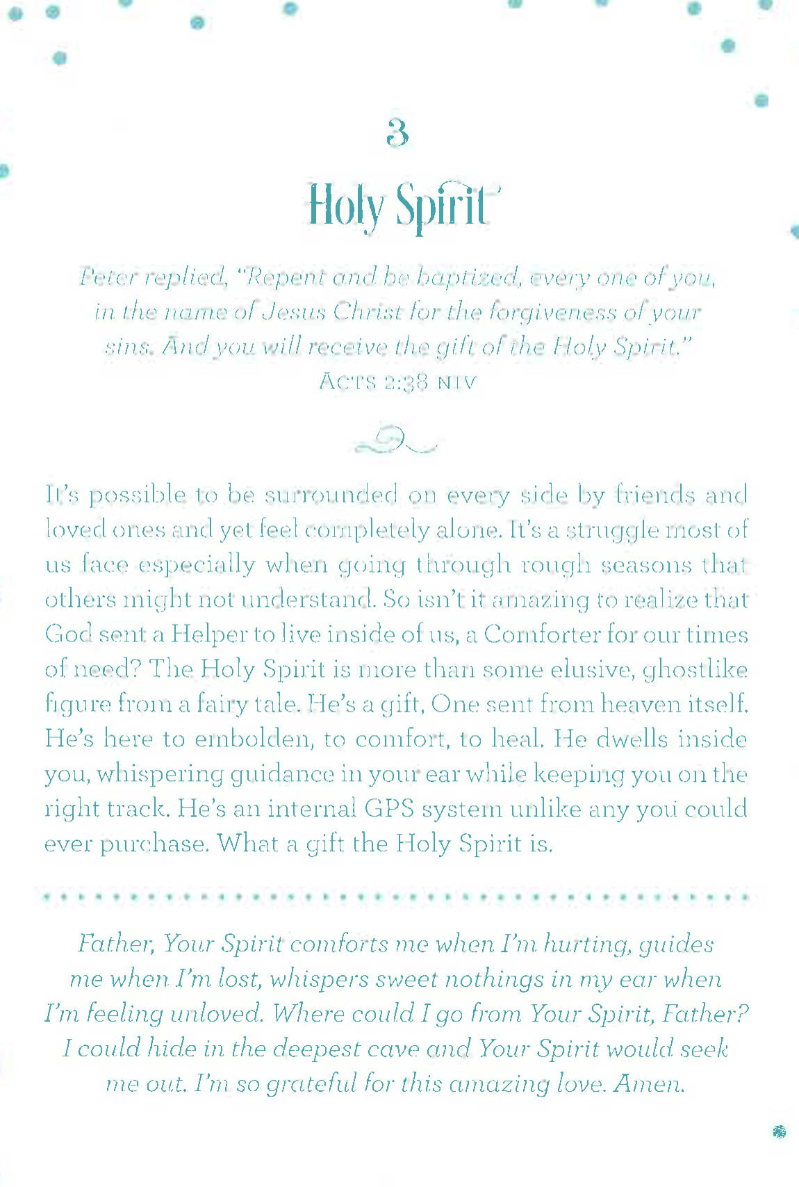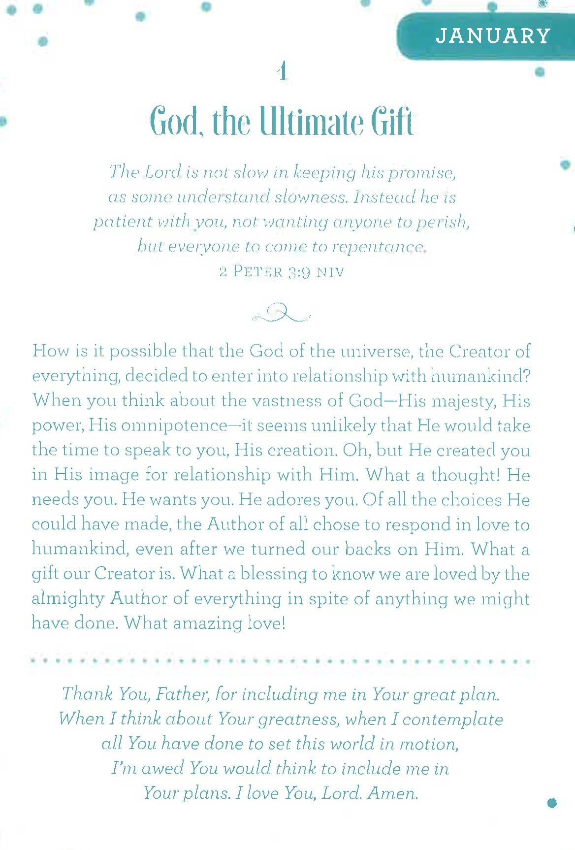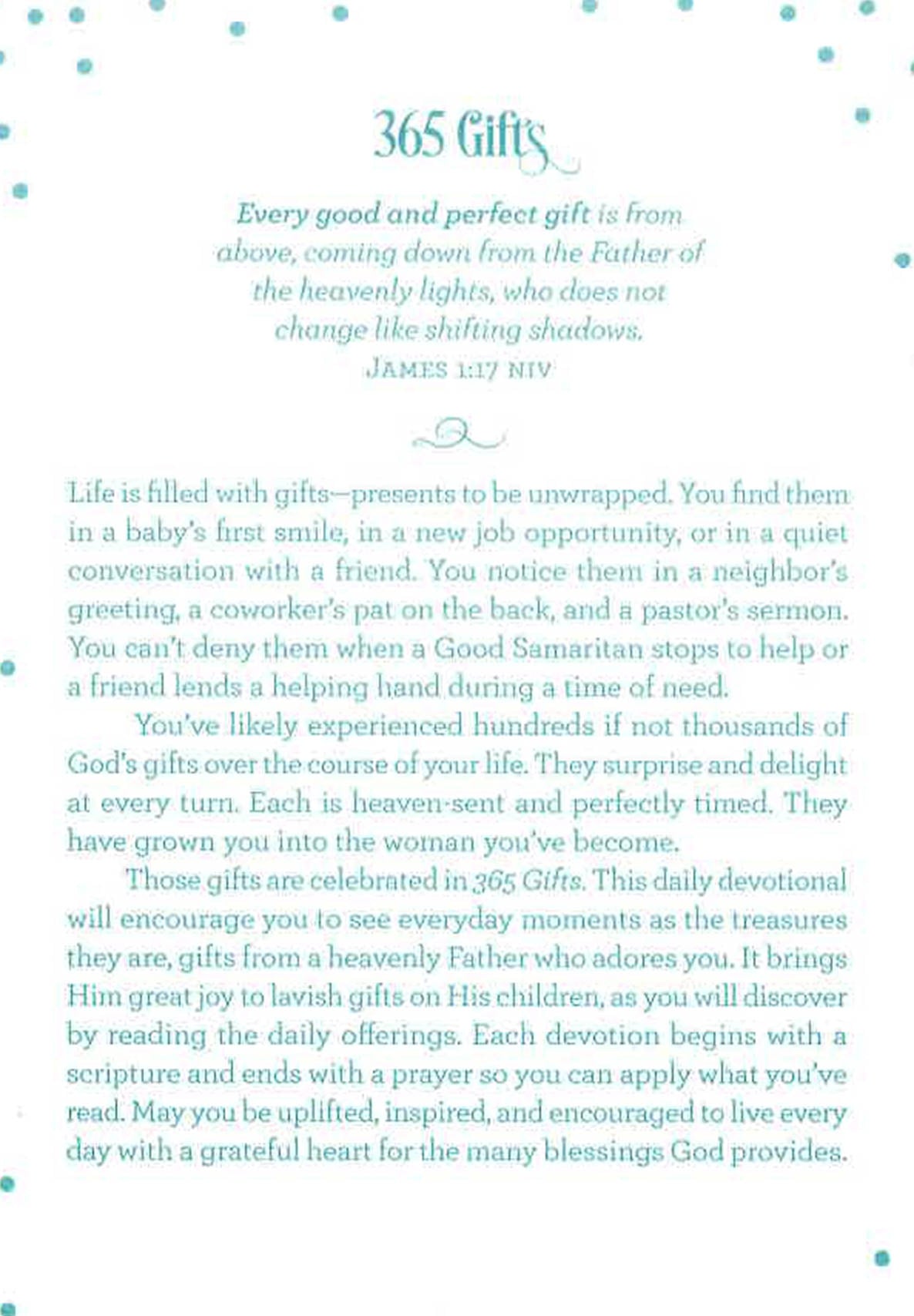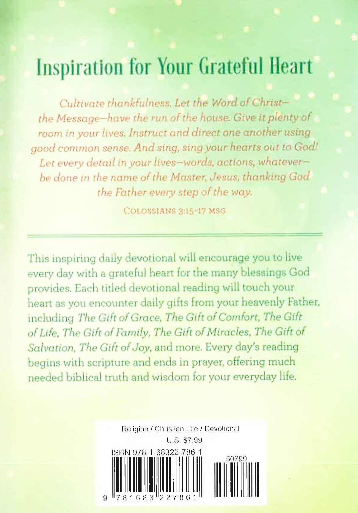 Rooted in the biblical truth of James 1:17: "Every good and perfect gift is from above, coming down from the Father of the heavenly lights. . ." This inspiring daily devotional encourages you to live every day with a grateful heart for the many blessings God provides. Each titled devotional reading will touch your heart as you encounter daily gifts from your heavenly Father, including THE GIFT OF GRACE, THE GIFT OF LOVE, THE GIFT OF LIFE, THE GIFT OF FAMILY, THE GIFT OF WORK, THE GIFT OF SALVATION, and THE GIFT OF PRAYER. Every day's reading begins with scripture and ends in prayer.