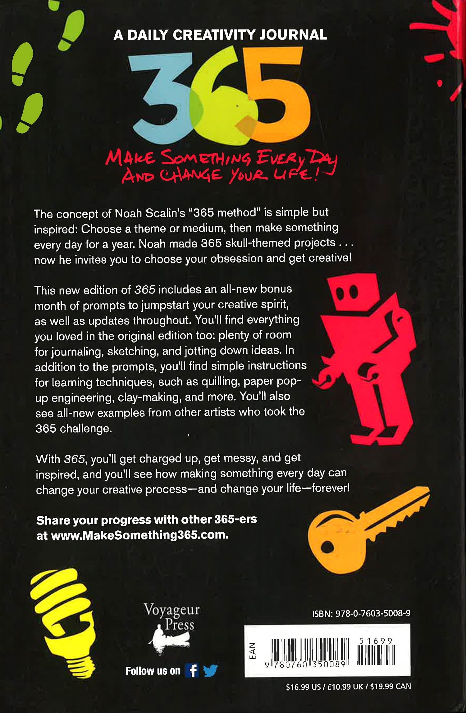 Your creative spirit is begging you to give it a new challenge. Your opportunity is here; will you take the plunge? The concept of Noah Scalin's "365 method" is simple and inspired: Choose a theme or medium, then make something every day for a year. Noah made 365 skull-themed projects . . . now he invites you to choose your obsession and get creative! Whether you're drawing or using photography or collage--you're strengthening an inner creative muscle. And in this new edition, there's even more to inspire you! You'll find a bonus month of new prompts--now there are more than 400 ways to jumpstart your creative spirit and get inspired! 365 New + Expanded Edition is meant to be marked up and scribbled in. It has space for journaling, sketching, and jotting down ideas--the perfect place to experiment with choosing subjects that matter to you then creating a massive body of work. You'll see how the "365 method" has inspired others, with features on artists and crafters who took the 365 challenge. You'll also have the opportunity to master new techniques you can then incorporate into your projects, including quilling, clay-making, paper pop-up engineering, and more. With 365 New + Expanded Edition, you'll get charged up, messy, and inspired, and you'll see how making something every day can change your creative process--and your life--forever!