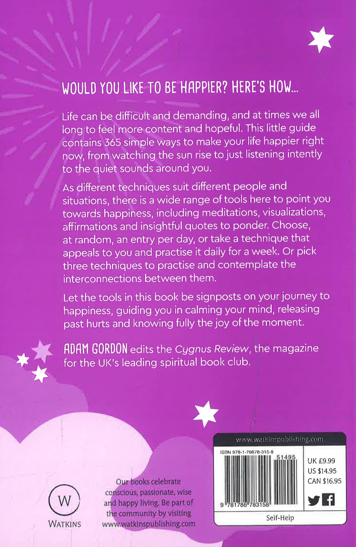 A miniature treasure trove of wisdom and insight, 365 Ways to Be Happy has everything you need as you embark on your road to enlightenment. A soothing blend of insights, affirmations and practical techniques, this is the perfect book to help your mind unwind from the hustle and bustle ofdaily life and to embark on a spiritual journey to new inspiring horizons. Packed full of illustrations, 365 Ways to Be Happy offers an around-the-clock supply of peace of mind.Life today is a swirl of stress, distraction and nonstop physical, mental and emotional exertion all set to the frantic, heart-pounding pace of the modern world. That's why this book is such an indispensable companion. Neatly organized into universal themes that have perplexed and inspired humankind for centuries, readers can thumb their way through passage after profound passage on love, health, happiness, parenting and just about everything else under the sun.