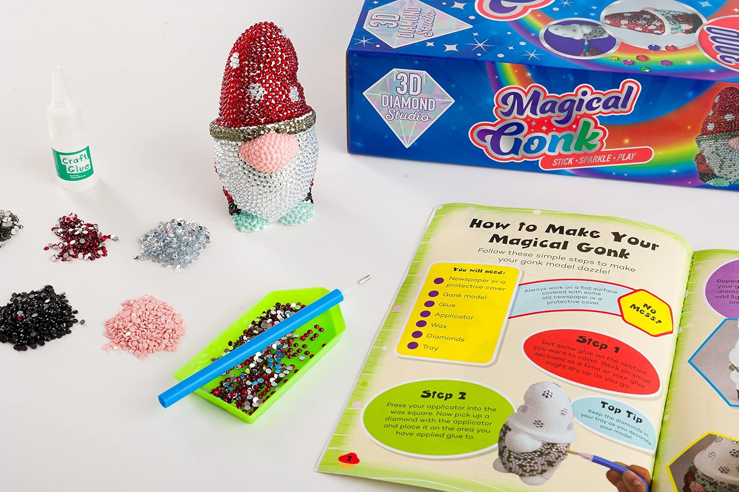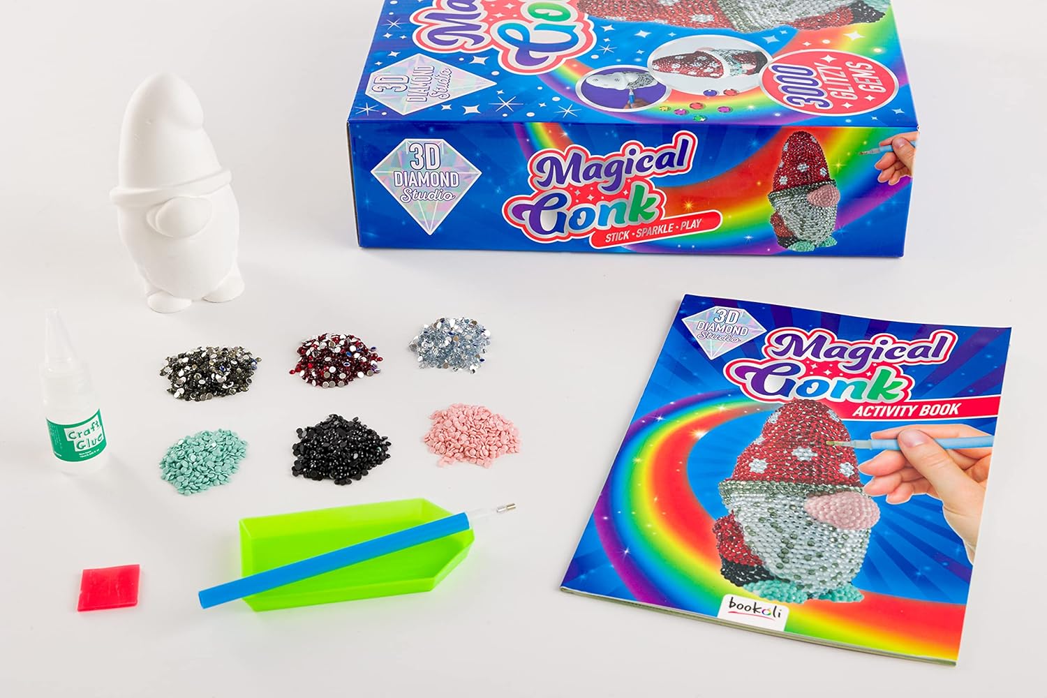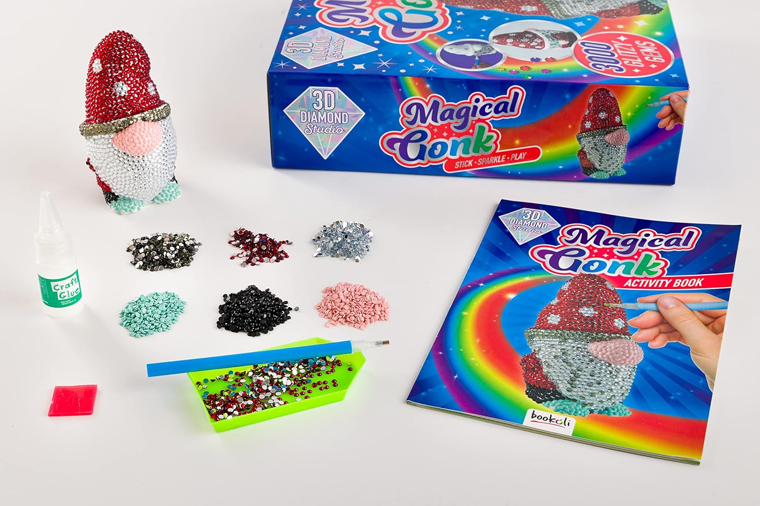 With 3000 glitzy crystals, you can create a unique look that will really pop. Then dive into the enchanting activity book filled with gonk doodles, games and puzzles.