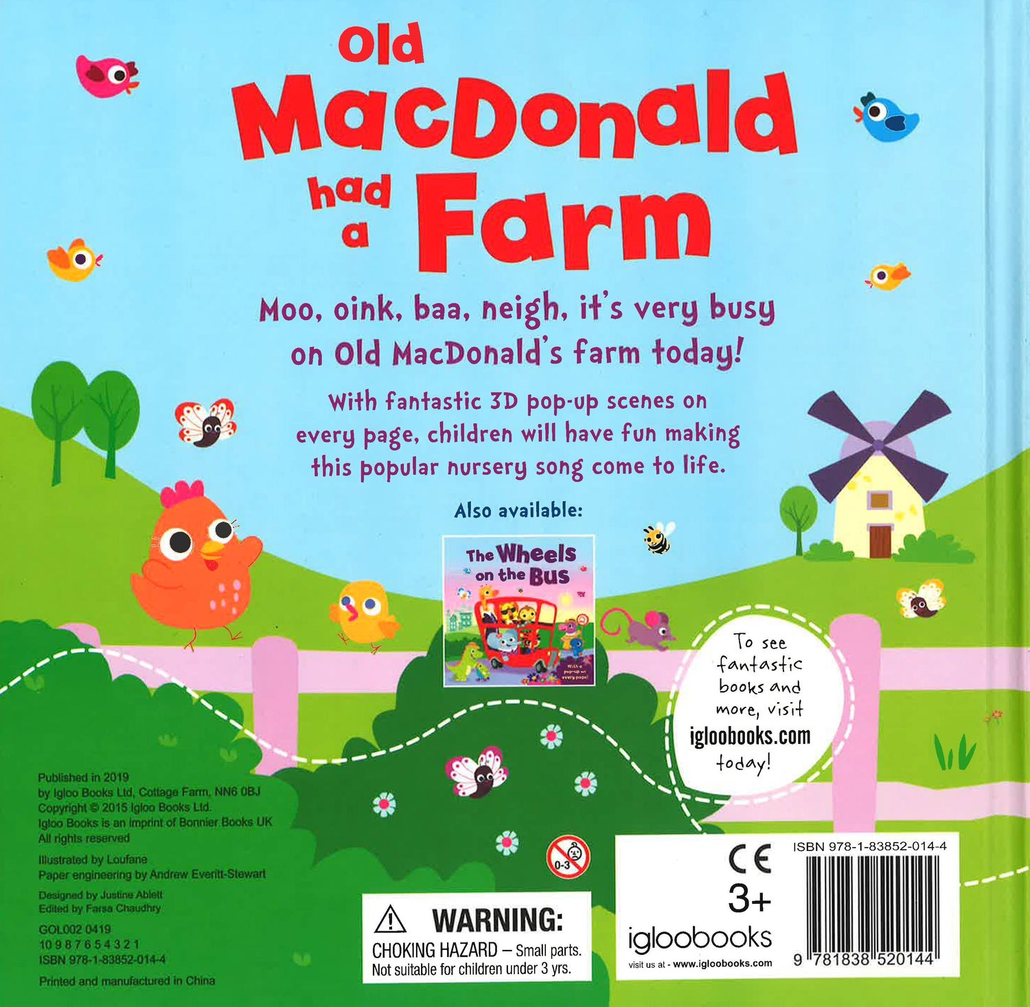 Moo, oink, baa, neigh, it's very busy on Old MacDonald's farm today! With fantastic 3D pop-up scenes on every page, children will have fun making this popular nursery song come to life. A wonderful interactive book for young children to read and enjoy. Suitable for those over the age of 3 years.