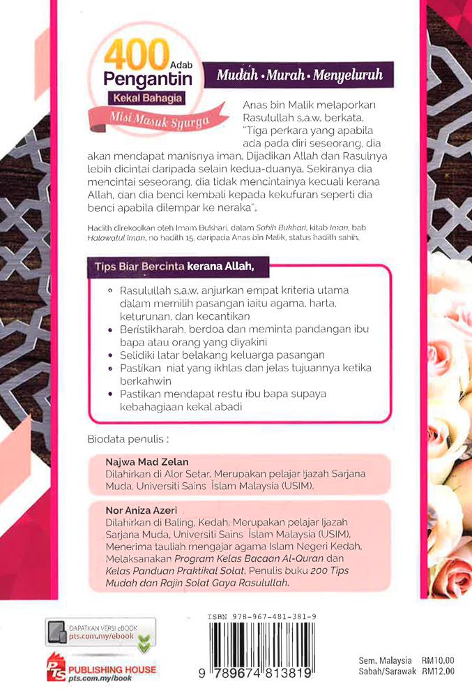 400 Adab Pengantin Kekal Bahagia merungkai tips dan beberapa doa pilihan yang sesuai dijadikan amalan serta panduan untuk memelihara diri dan membina keluarga bahagia agar sentiasa mendapat keberkatan dan rahmat daripada Allah S.W.T.