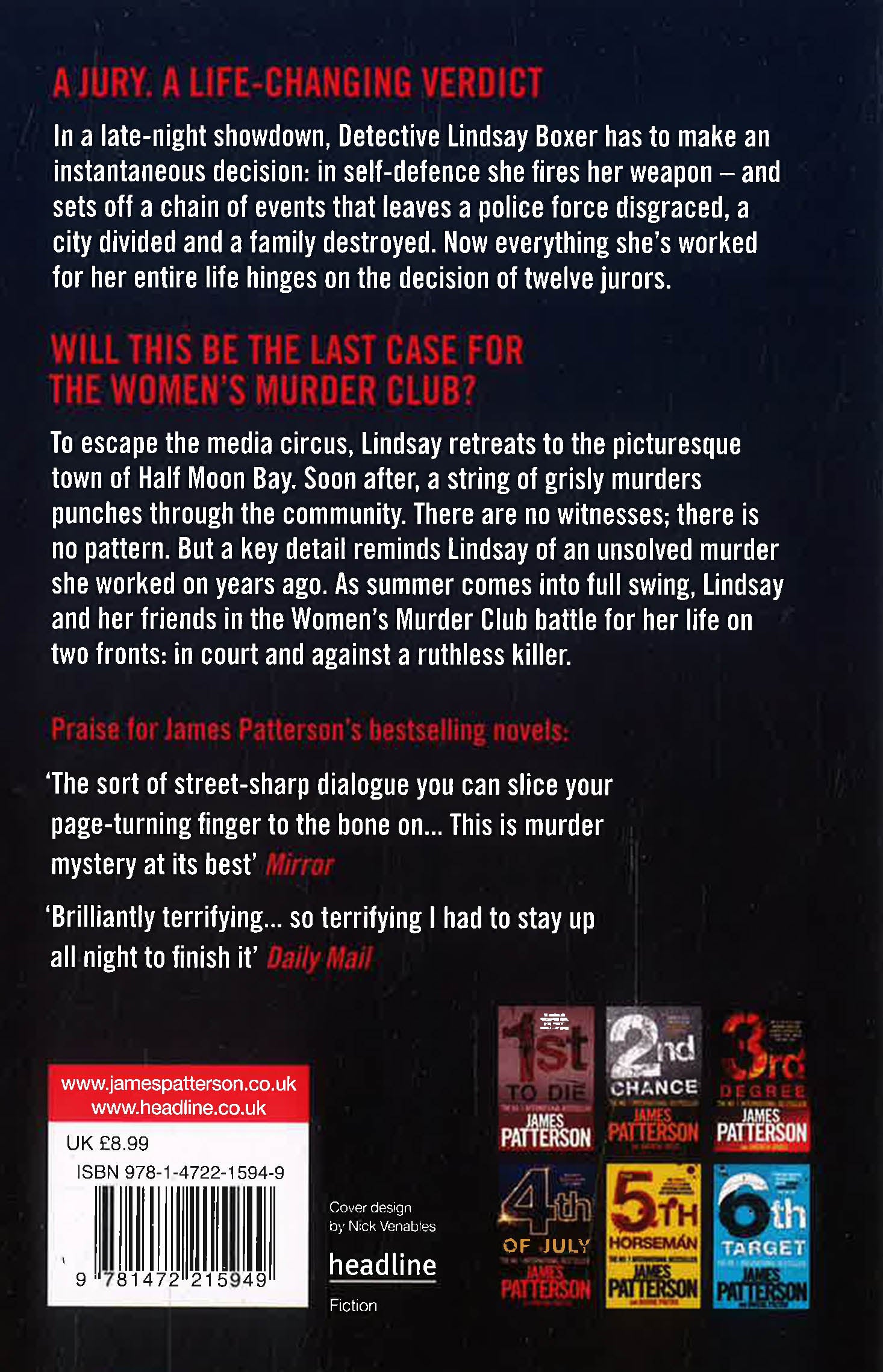 In a late-night showdown, Detective Lindsay Boxer has to make an instantaneous decision: in self-defence she fires her weapon - and sets off a chain of events that leaves a police force disgraced, a city divided and a family destroyed. Now everything she's worked for her entire life hinges on the decision of twelve jurors. To escape the media circus, Lindsay retreats to the picturesque town of Half Moon Bay. Soon after, a string of grisly murders punches through the community. There are no witnesses; there is no pattern. But a key detail reminds Lindsay of an unsolved murder she worked on years ago. As summer comes into full swing, Lindsay and her friends in the Women's Murder Club battle for her life on two fronts: in court and against a ruthless killer.