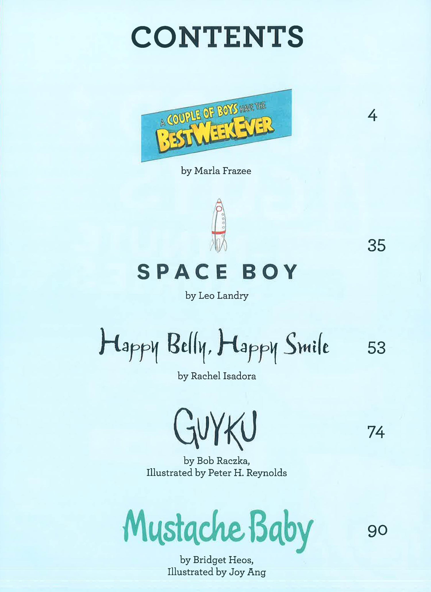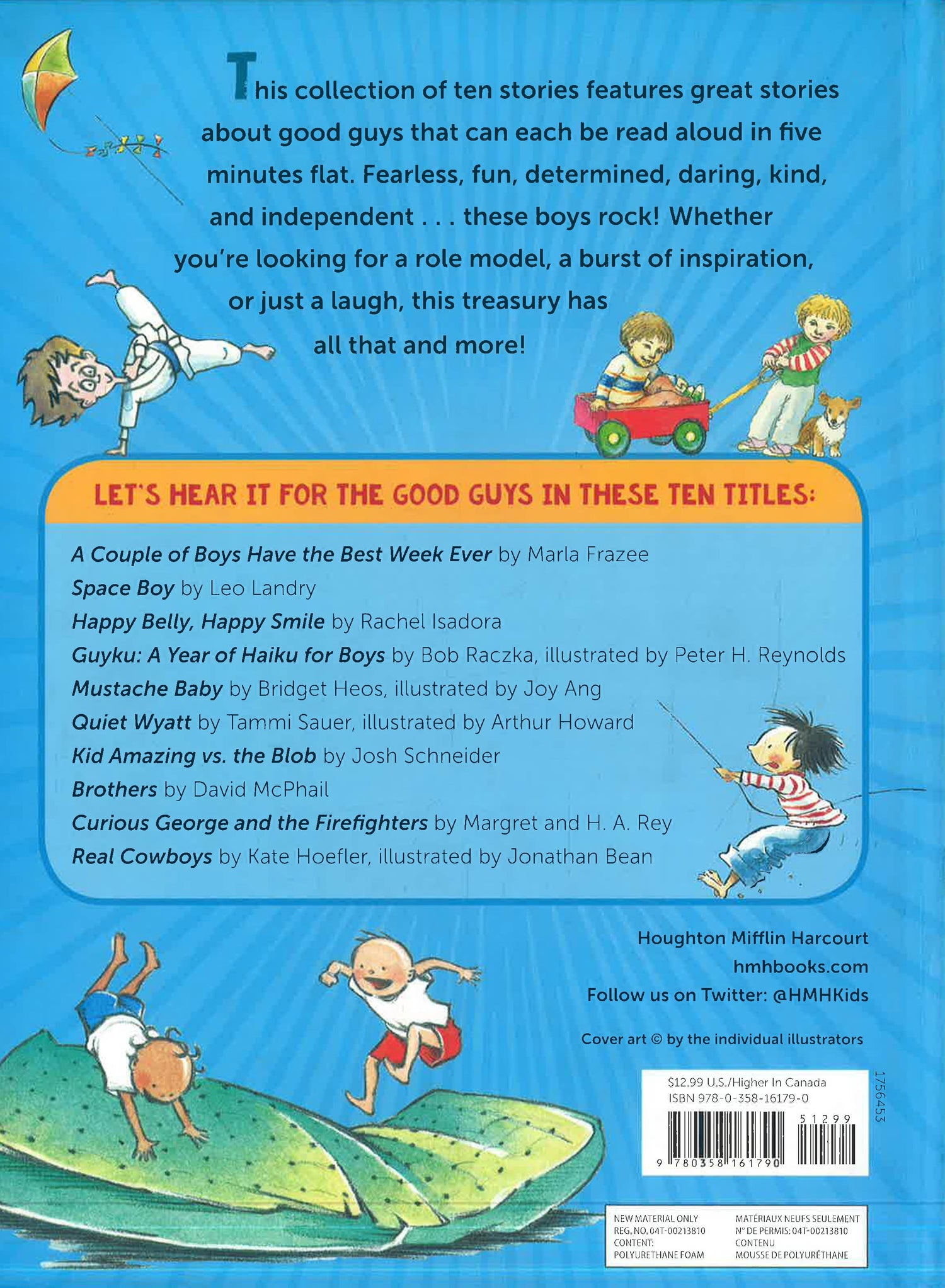 This collection of ten stories features caring, adventurous, and silly boys whose stories can each be read aloud in five minutes flat. Fearless, fun, determined, daring, kind, and independent . . . these boys rock! Whether you're looking for a compassionate role model, a quick pick-me-up, a jolt of inspiration, or just a giggle, this treasury has all that and more! Be inspired to be yourself with these ten titles: Brothers by David McPhail; Happy Belly, Happy Smile by Rachel Isadora; Quiet Wyatt by Tammi Sauer, illustrated by Arthur Howard; Kid Amazing vs. the Blob by Josh Schneider; Space Boy by Leo Landry; Real Cowboys by Kate Hoefler, illustrated by Jonathan Bean; Guyku by Bob Raczka, illustrated by Peter H. Reynolds; Mustache Baby by Bridget Heos, illustrated by Joy Ang; A Couple of Boys Have the Best Day Ever by Marla Frazee; and Curious George and the Firefighters by H.A. Rey.