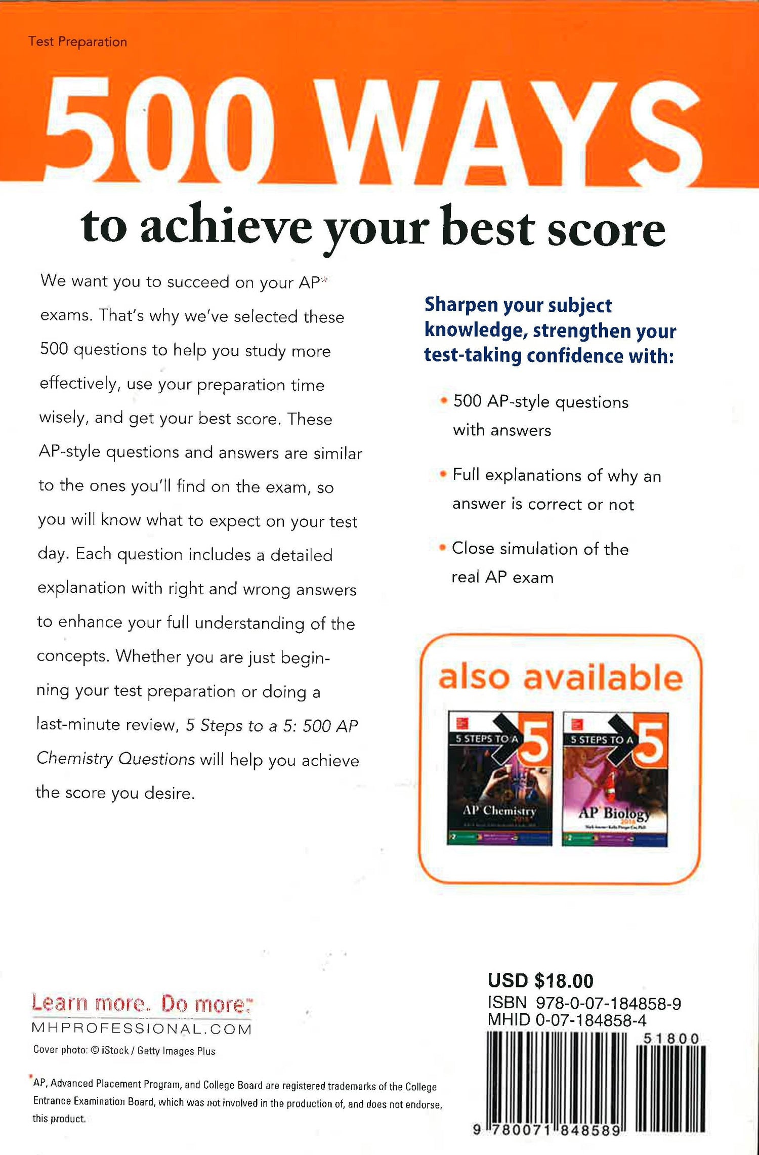 Get ready for your AP Chemistry exam with 500 AP Chemistry questions updated for all the latest exam changes We want you to succeed on your AP exams. That's why we've selected these 500 questions to help you study more effectively, use your preparation time wisely, and get your best score. These AP-style questions and answers are similar to the ones you'll find on the exam, so you will know what to expect on your test day. Each question includes detailed explanation with right and wrong answers to enhance your full understanding of the concepts. Whether you are just beginning your test preparation or doing a last-minute review, 5 Steps to a 5 500 AP Chemistry Questions, 2ed will help you achieve the score you desire. 500 AP-style questions and answers Complete answer explanations for every question What you really need to know to achieve a high score