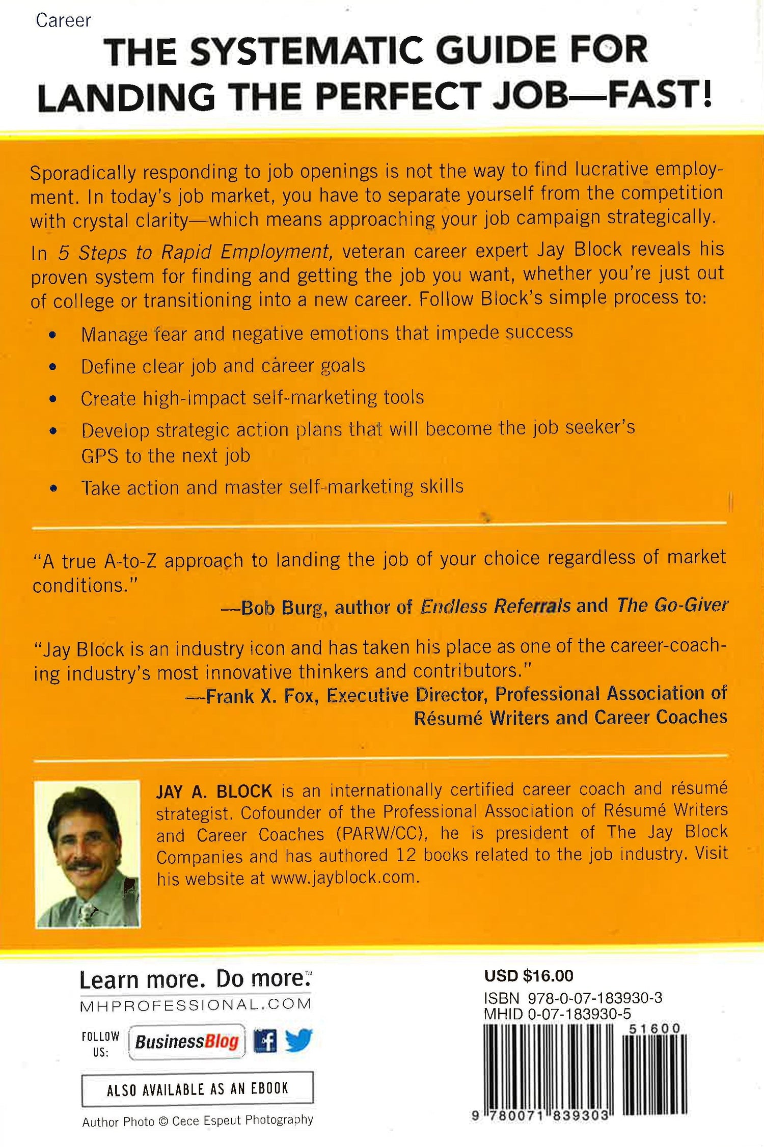"Jay Block is an industry icon and has taken his place as one of the career-coaching industry's most innovative thinkers and contributors." -- Frank X. Fox, Executive Director, Professional Association ofResume Writers and Career Coaches