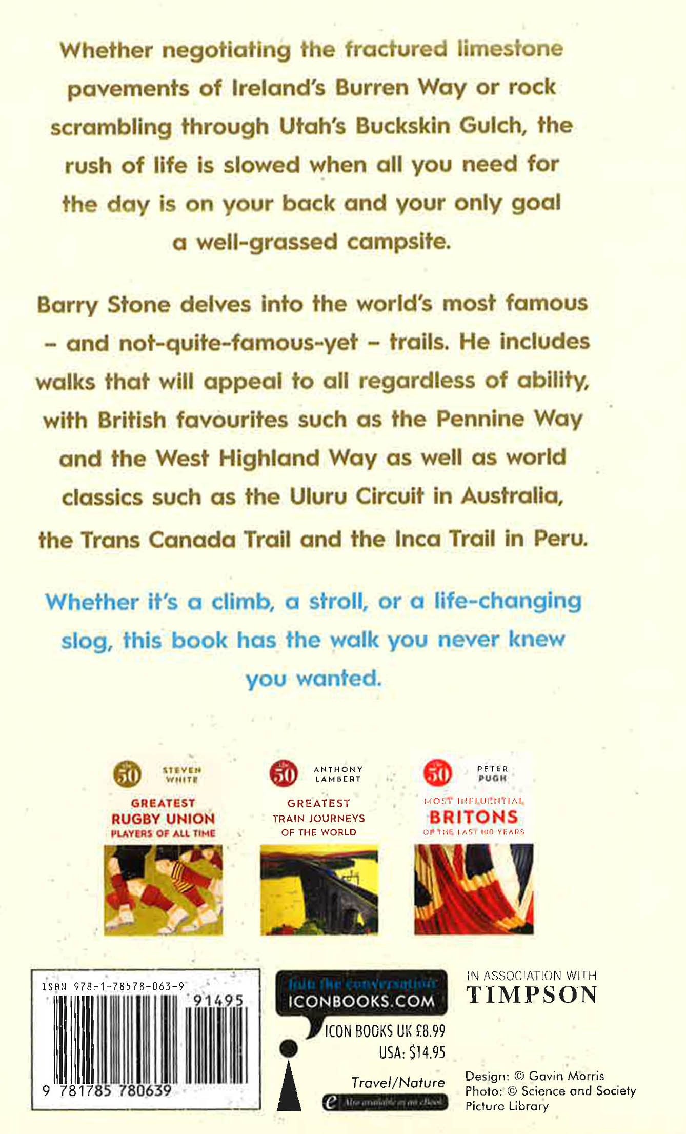 Barry Stone, author of 1001 Walks You Must Experience Before You Die, delves into some of the lesser-known aspects of the world's most famous - and not-quite-famous-yet - trails. The perfect accompaniment to practical guidebooks, Stone relates how slings and carabiners kept him from falling headlong off the Sydney Harbour Bridge, and reports on the progress of the continental-wide monster, the Trans Canada Trail, gaps in which are still being filled by countless grass-roots communities. With walks that will appeal to everyone regardless of ability, The 50 Greatest Walks of the World includes British classics such as the Pennine Way, Offa's Dyke Path, and the Old Man of Hoy as well as personal favourites such as Italy's Cinque Terre Classic and the Isle of Skye's Trotternish Ridge, one of Britain's finest ridge traverses with almost 2,500m of ascents. Whether it's a climb, a stroll, or a life-changing slog, this book has the walk for you.