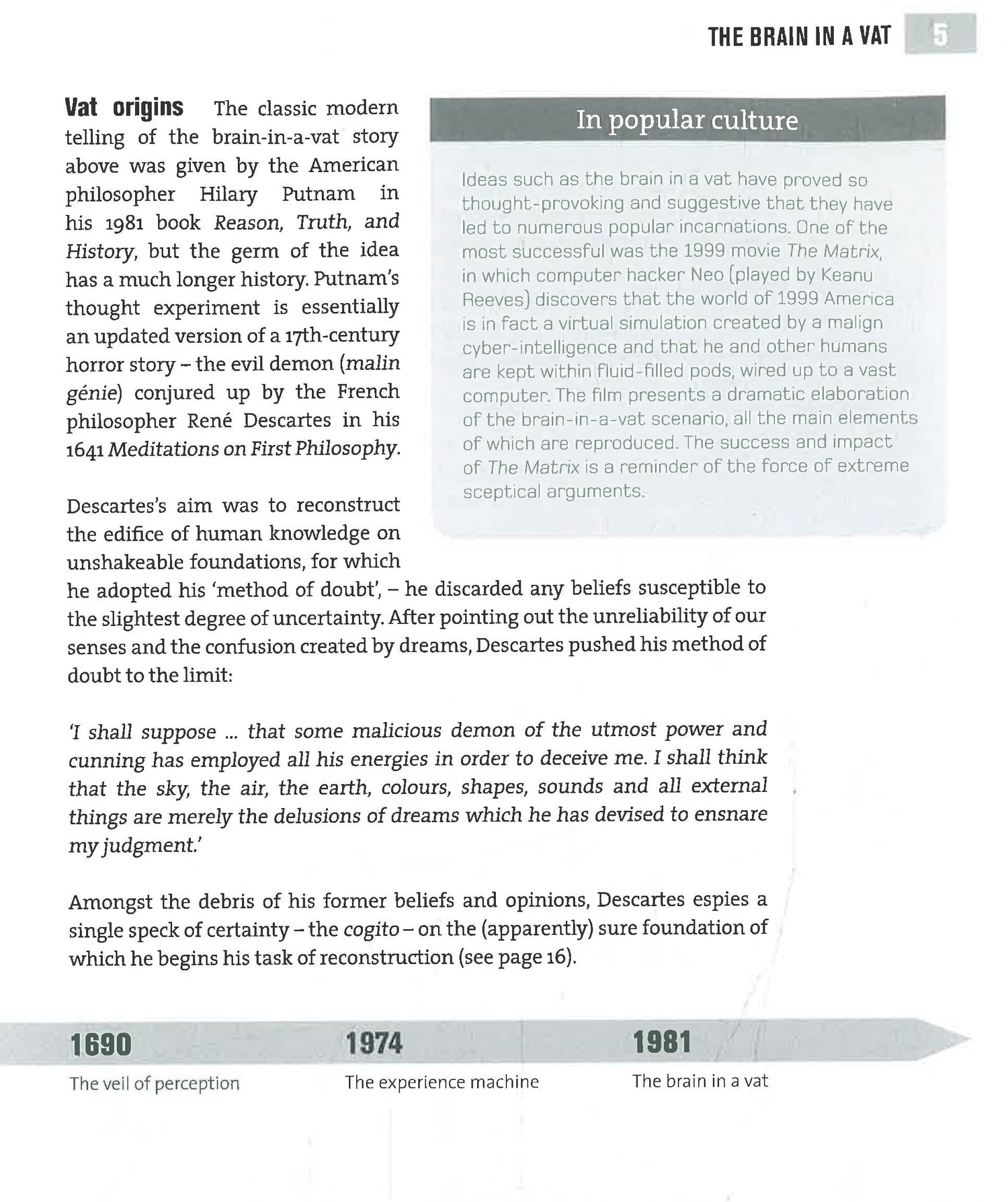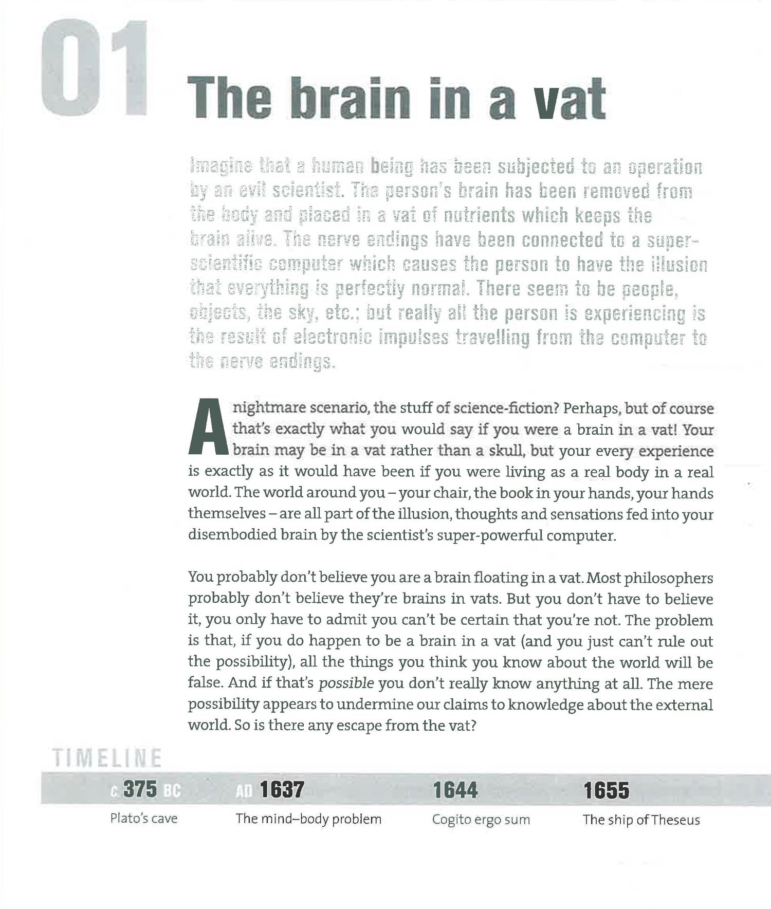 Contents include: The brain in a vat, Plato's cave, Cogito ergo sum, The mind-body problem, The boo/hurrah theory, Ends and means, The categorical imperative, Acts and omissions, The rights of animals, The gambler's fallacy, Paradigm shifts, Occam's razor, Positive and negative freedom, Theories of punishment and Just war.