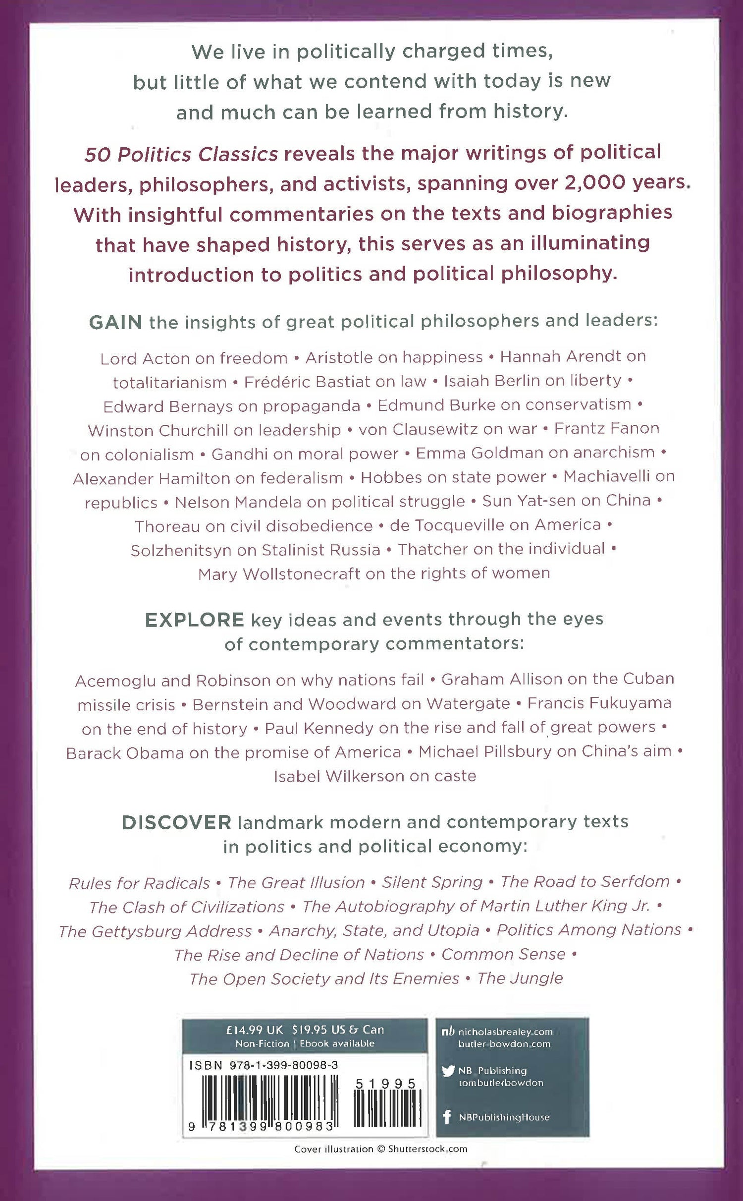 From Abraham Lincoln to Nelson Mandela, and from Aristotle to George Orwell, 50 Politics Classics distils the essence of the books, pamphlets, and speeches of the major leaders and great thinkers that drive real-world change. Spanning 2,500 years, left and right, thinkers and doers, Tom Butler-Bowdon covers activists, war strategists, visionary leaders, economists, philosophers of freedom, feminists, conservatives and environmentalists, right up to contemporary leaders and thought leaders such as Barack Obama, Isobel Wilkerson and Michael Pillsbury.