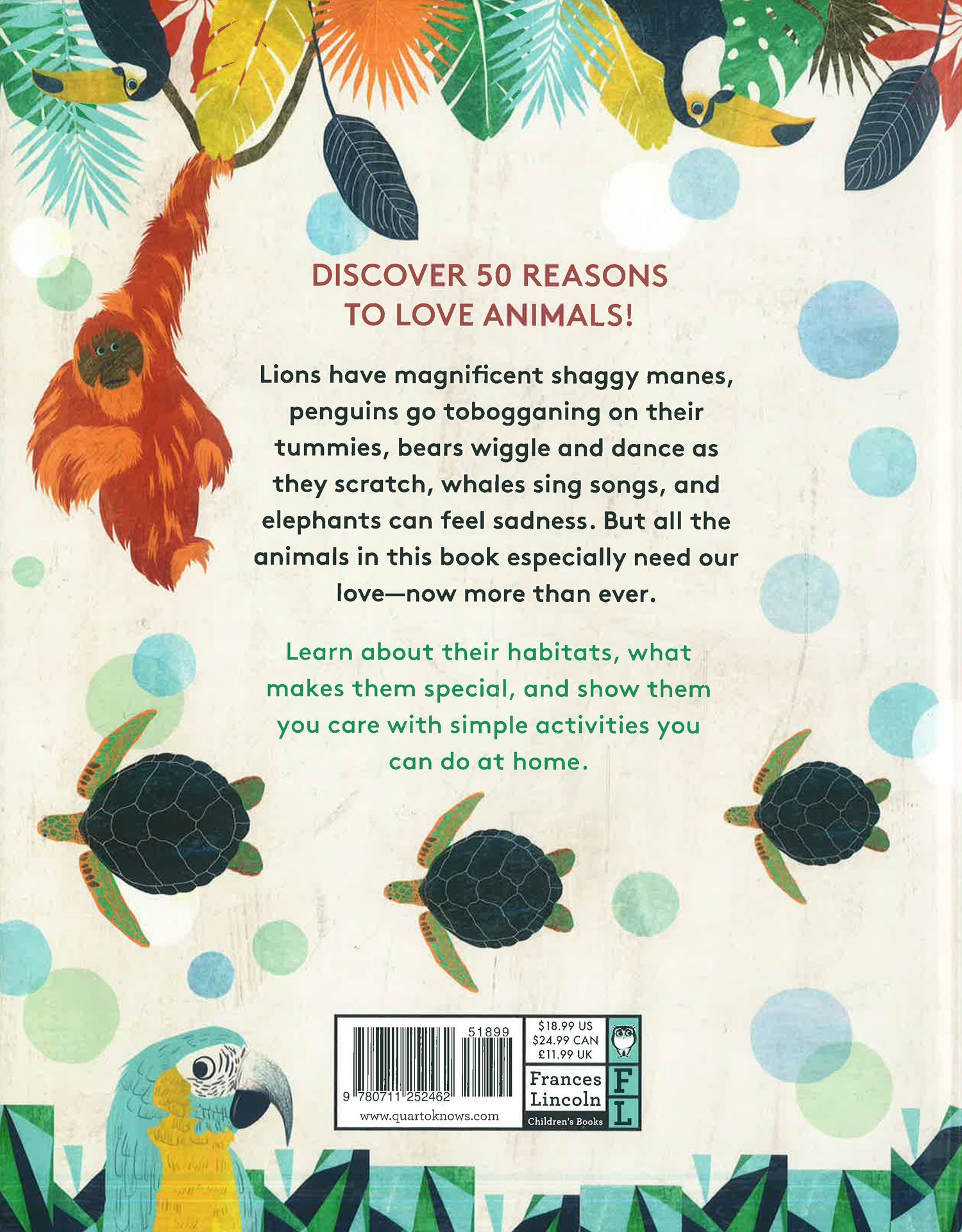 Discover 50 reasons to love animals! Lions have magnificent shaggy manes, penguins go tobogganing on their tummies, bears wiggle and dance as they scratch, whales sing songs, and elephants can feel sadness. But all the animals in this book especially need our love – now more than ever. Learn about their habitats, what makes them special, and show them you care with simple activities you can do at home.