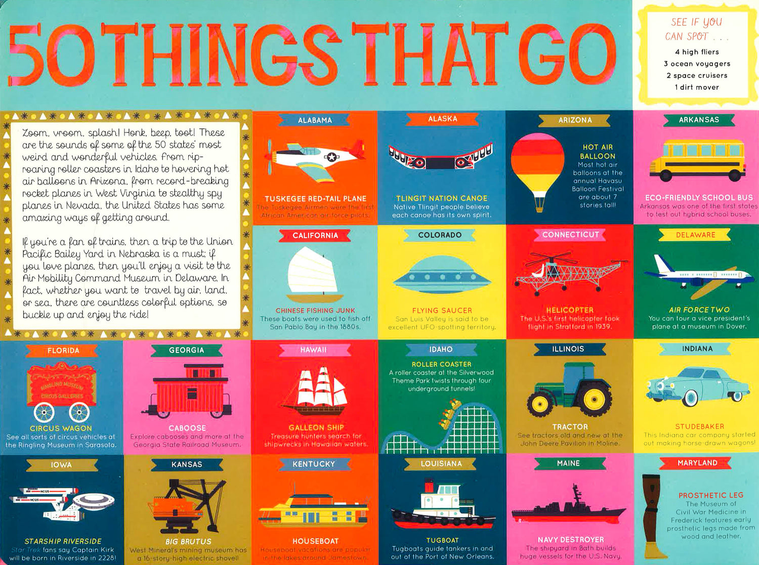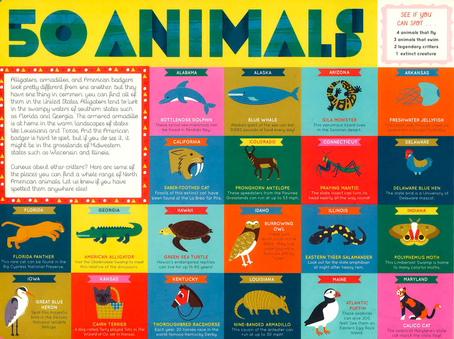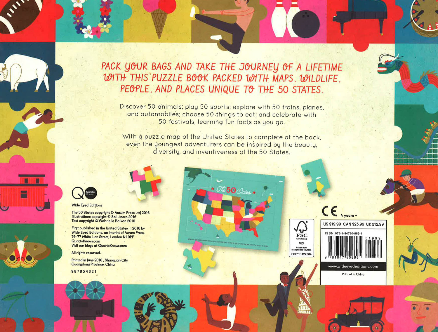 Pack your bags and take the journey of a lifetime with this puzzle book packed with maps, wildlife, people, and places unique to the 50 states. As a holiday companion title to The 50 States, spreads are thematically ordered by subject, featuring 50 Animals, 50 Things that Go, 50 People, 50 Places, 50 Festivals and Cultural events, plus a make-your-own puzzle of the 50 states on the final spread.