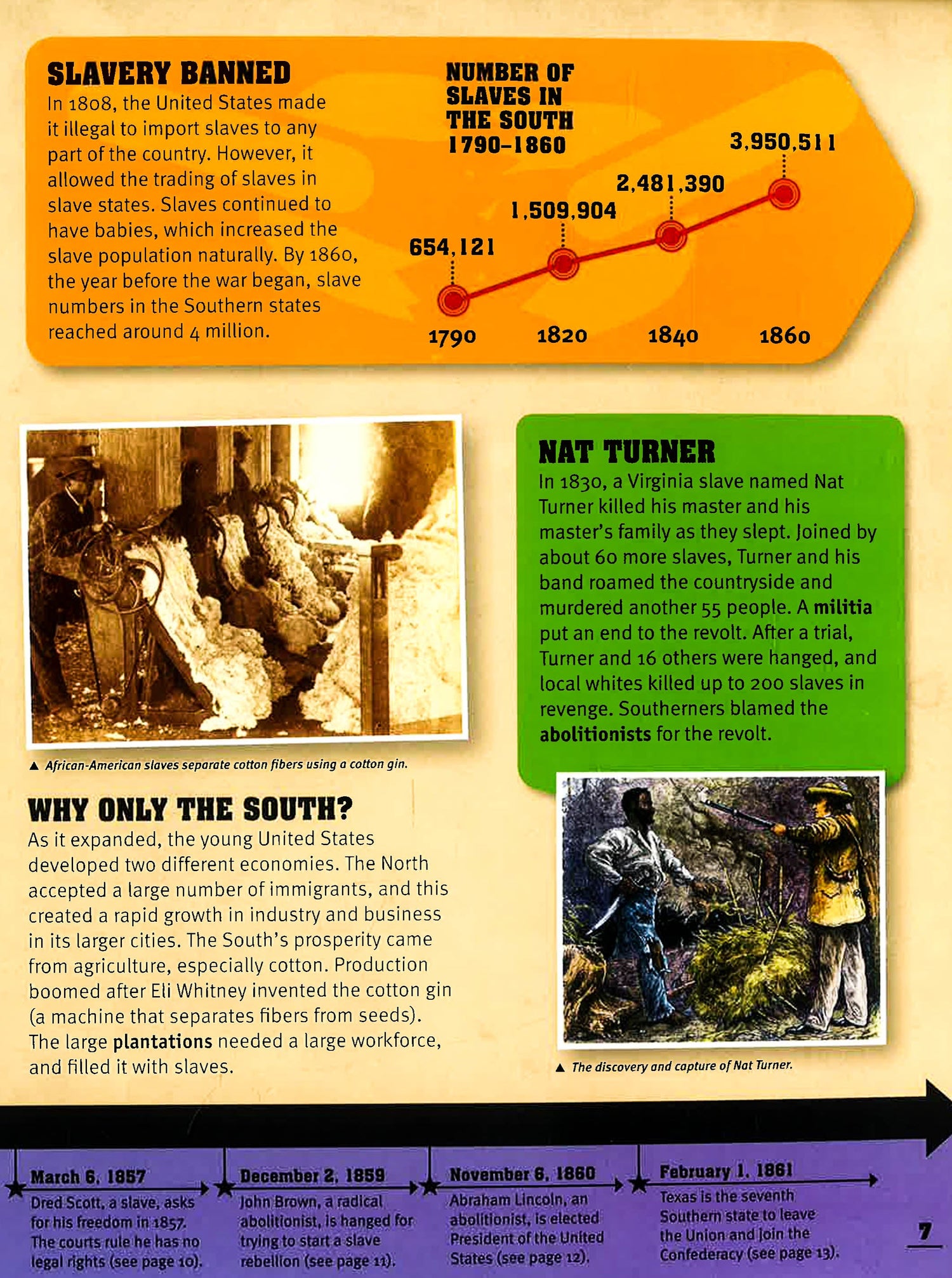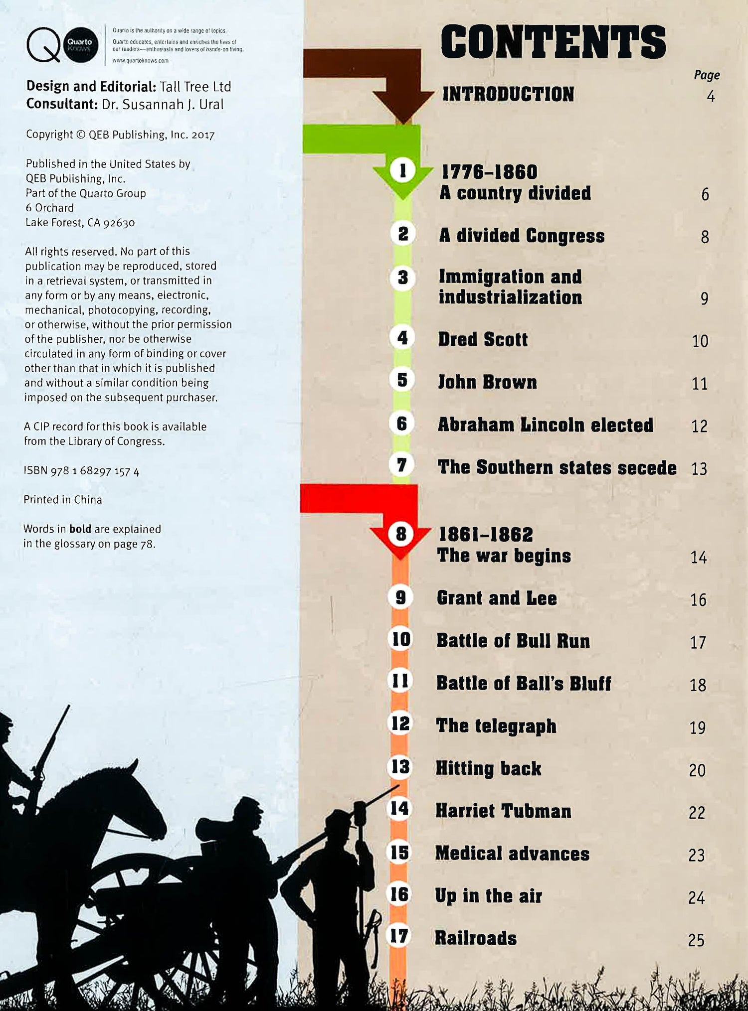 In 1860, the North and the South of the United States were very different societies. The North had abolished slavery in the early 19th century, while the South still relied on slaves to work on its farms and plantations. The first chapter will set the scene, showing how simmering tensions over the right to keep slaves in the new states that were being founded as the country pushed westwards eventually erupted into war following the election of the pro-abolition president, Abraham Lincoln. The middle chapters provide an overview of the major battles that followed the South's decision to secede from the Union. Momentum swung backwards and forwards in the early years before the North eventually gained the upper hand, forcing the South's surrender in 1865. The final chapter looks at the aftermath and consequences of the war, as the United States of America began the process of healing and reconstruction in the post-slavery era. The book highlights all the most important figures of the period, as well as focusing on the military and political strategies of both sides and the influence of the wider world on the conflict. The text is lively and clearly presented with fact panels providing fascinating extra pieces of information and background stories.