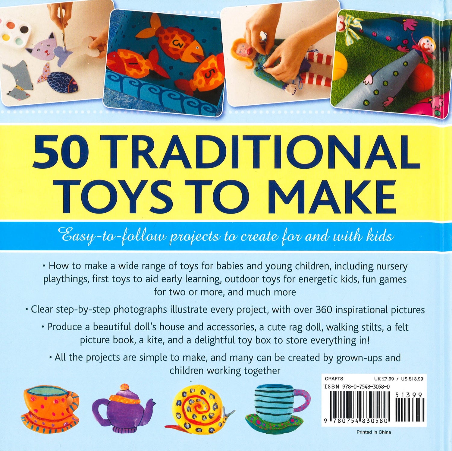 This title contains easy-to-follow projects to create for and with kids. How to make a wide range of toys for babies and young children, including nursery playthings, first toys to aid early learning, outdoor toys for energetic kids, fun games for two or more, and much more. Clear step-by-step photographs illustrate every project, with over 360 inspirational pictures. You can make a beautiful doll's house and accessories, a cute rag doll, walking stilts, a felt picture book, a kite, and a delightful toy box to store everything in. All the projects are simple to make and can be created by grown-ups and children working together. In a world full of plastic and electronics, this book offers something new - and a touch of nostalgia - to anyone who wants to make truly original and personal playthings for children of all ages. Here you will find a wonderful variety of traditional toys that will still delight, together with new ideas you can make using completely natural materials - fabrics, wood, clay, yarn and paper.The book contains instructions for 50 fabulous ideas you can make at home, from wooden building blocks, a knitted polar bear, an activity floor cushion and a nursery mobile for babies, to fun musical instruments, skittles, finger puppets and a jack-in-the-box for young kids, and absorbing games and outdoor toys for older children.From knitting and sewing to papercrafts and simple woodworking, there is a wide range of techniques and projects to discover and make for and with children of all ages.