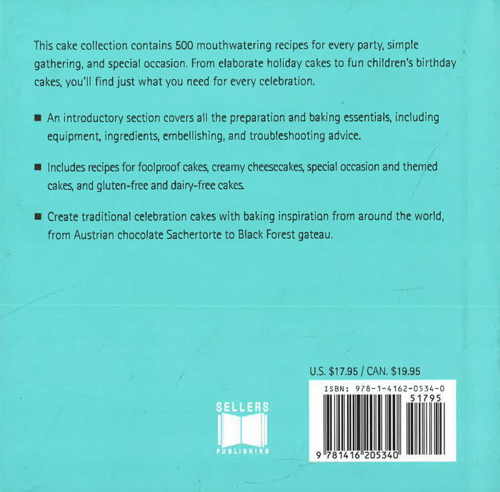 500 Cakes by Susannah Blake. Has the right recipe for any occasion. From easy refrigerator cakes to elaborate creamy gateaux, from delicious gluten-free cakes to sumptuous layered confections. This book coversall style and flavors for all ages. Measures 61/4'' x 61/4''. Man-made-material.