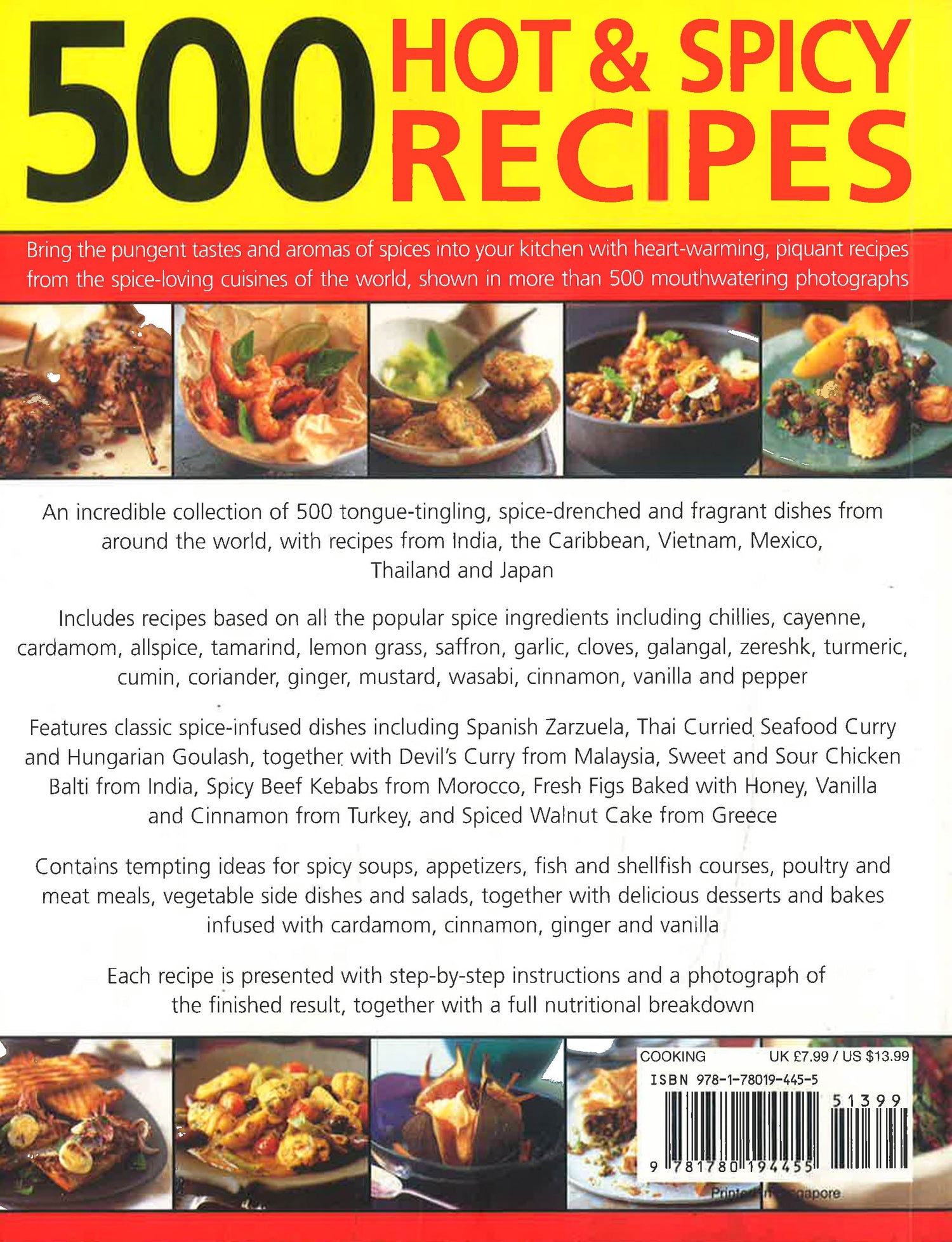 This fabulous book brings together 500 aromatic recipes from appetizers through main courses and desserts, all of which are inspired by the heat and taste of the world's spices. The book includes recipes from India, the Far East, the Caribbean and the African continent, as well as classic spice-infused dishes from Jewish and Arabic traditions. There are soups and snacks, fiery fish and shellfish dishes, fragrant poultry and meat recipes, tangy vegetarian main courses, piquant salads, vegetable side dishes, and spice-drenched sweet cakes and desserts.With over 500 photographs and step-by-step instructions, this book is the essential resource for lovers of spicy food.
