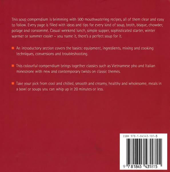 Whether it's a bowl of steaming hot chicken noodle sop when you're feeling under the weather or an elegant, beautifully garnished, iced concoction served as an appetizer - there really is the perfect bowl of soup for every occasion. Casual weekend lunch, simple supper, sophisticated starter, winter warmer or summer cooler - you name it, there's a perfect soup for it. Soup has fabulously rich history as a food that is enjoyed all over the world. Every country has their favourites, from Vietnamese pho and Moroccan harira to Scottish cock-a-leekie and Greek avgolemono. This colourful compendium brings together all the classics, along with new and contemporary twists on classic themes. With 500 mouth-watering soups, this book is packed with inspirational ideas for every kind of sop, broth, bisque, chowder, potage and consomme. Every page is filled with ideas and tips to ensure success - making it the only book on making soups that you will ever need. This title is the latest addition to Apple's best-selling "500" series. It is split into ten easy-to-use chapters. With fabulous soups for every occasion, take your pick from cool and chilled, smooth and creamy, healthy and wholesome, meals in a bowl or soups that you can whip up in 20 minutes or less.