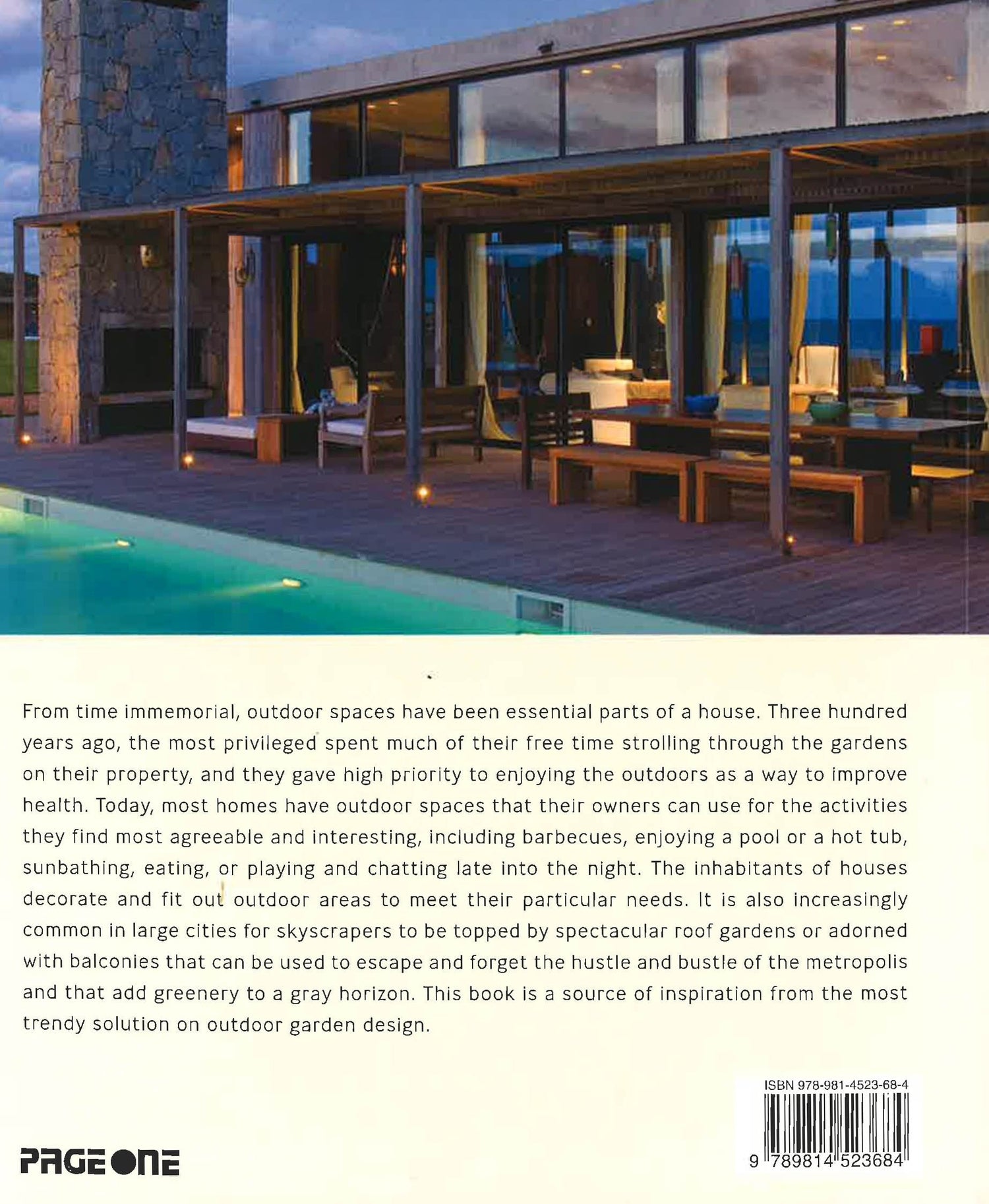 From time immemorial, outdoor spaces have been essential parts of a house. Three hundred years ago, the most privileged spent much of their free time strolling through the gardens on their property, and they gave high regard to enjoying the outdoors as a way to improve health. Today, most homes have outdoor spaces that their owners can use for the activities they find most agreeable and interesting, including barbecues, enjoying a pool or a hot tub, sunbathing, eating, or playing and chatting late into the night. The inhabitants of houses decorate and create outdoor areas to meet their particular needs. It is also increasingly common in large cities for skyscrapers to be topped by spectacular roof gardens or adorned with balconies that can be used to escape and forget the hustle and bustle of the metropolis and that add greenery to a grey horizon. This book is a source of inspiration from the most trendy solution on outdoor garden design.