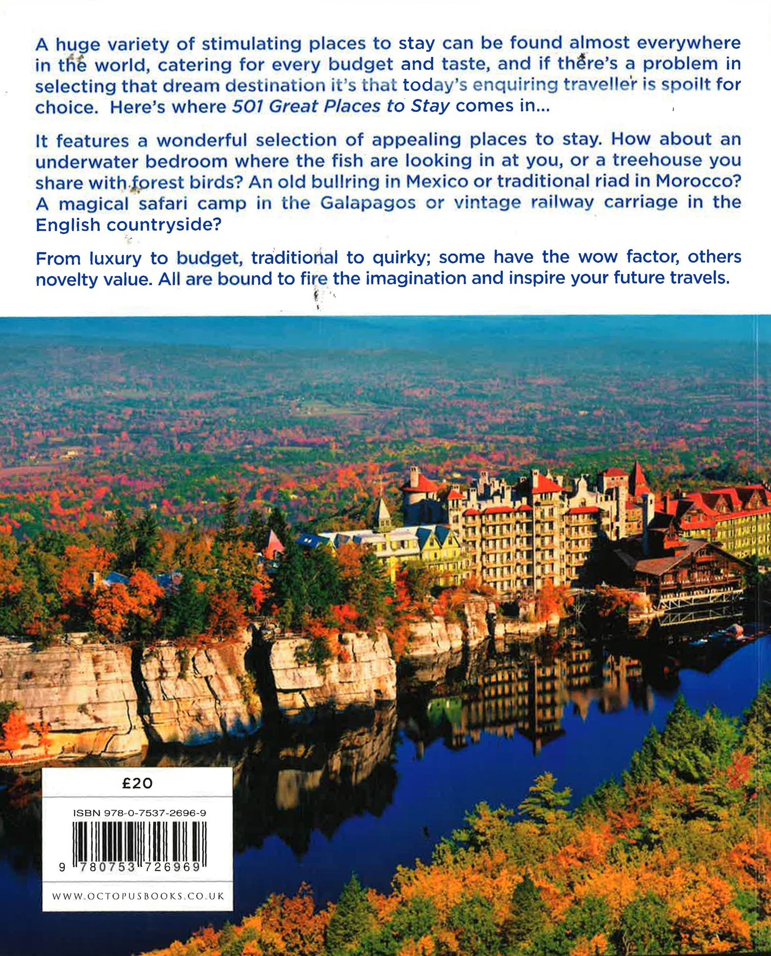 501 Great Places to Stay features a wonderful selection of appealing places to stay. How about an underwater bedroom where the fish are looking in at you, or a treehouse you share with forest birds? An old bullring in Mexico or traditional riad in Morocco? A magical safari camp in the Galapagos or vintage railway carriage in the English countryside? A five-star hotel in one of the world's great capitals or mud hut in northern India? An island paradise in the sunny Pacific or ice hotel inside the Arctic Circle? An eco-resort on Easter Island or ger in the Gobi Desert? A haunted hotel in New Mexico or castle in Ireland? A New England colonial inn or 15th-century manor house in the English countryside. A Victorian steamship in Peru or cave in Spain? A Napoleonic fortress in France or windmill in Greece? A paper house in Japan or working cattle station in the Australian outback? A tipi in the Canadian wilderness or jungle lodge in South America? A (grounded) jumbo jet or old gaol complete with cells? From luxury to budget, traditional to quirky; some have the wow factor, others novelty value. All are bound to stimulate the imagination and inspire your future travels.