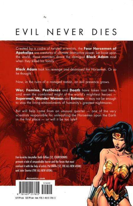 Written by Keith Giffen Art by Pat Olliffe & John Stanisci Cover by Ethan Van Sciver The unstoppable villains of the groundbreaking weekly series 52 rise again in this volume collecting the 6-issue miniseries! They are the Four Horsemen - War, Pestilence, Famine, Death - living embodiments of the Dread Ages of the distant world of Apokolips, and they mean to remake the Earth in their own image!