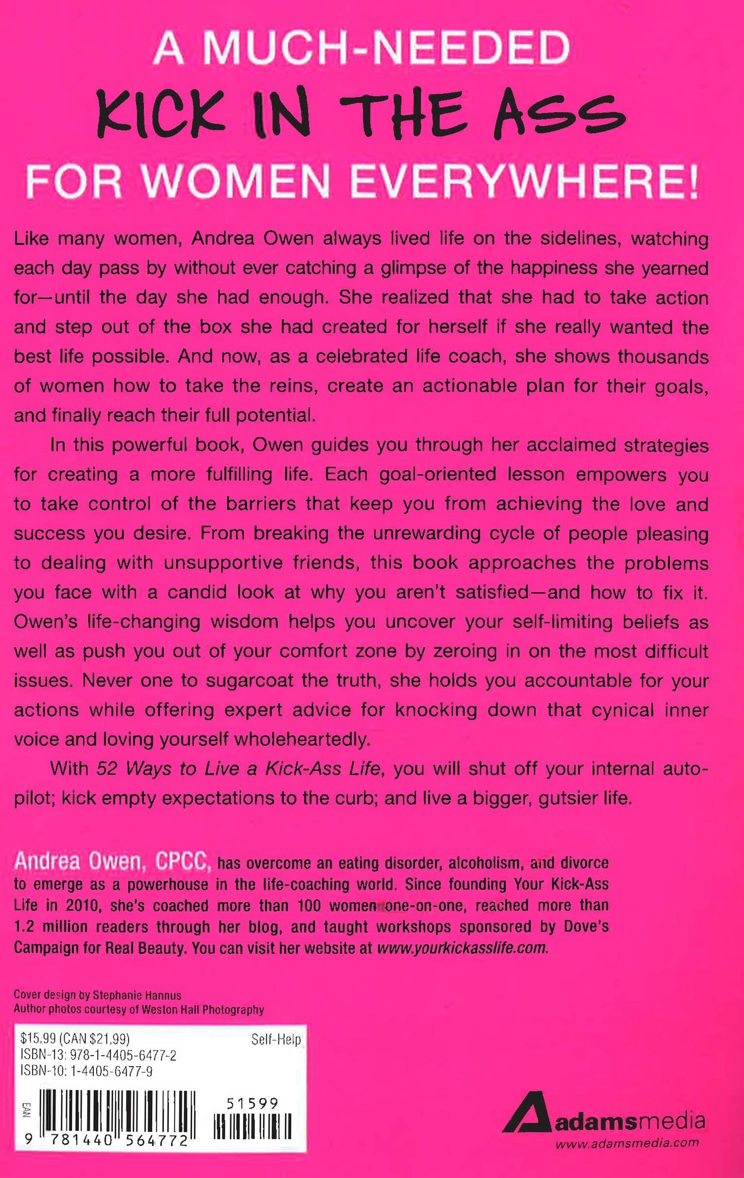 With 52 Ways to Live a Kick-Ass Life, you will shut off your internal auto-pilot; kick empty expectations to the curb; and live a bigger, gutsier life.