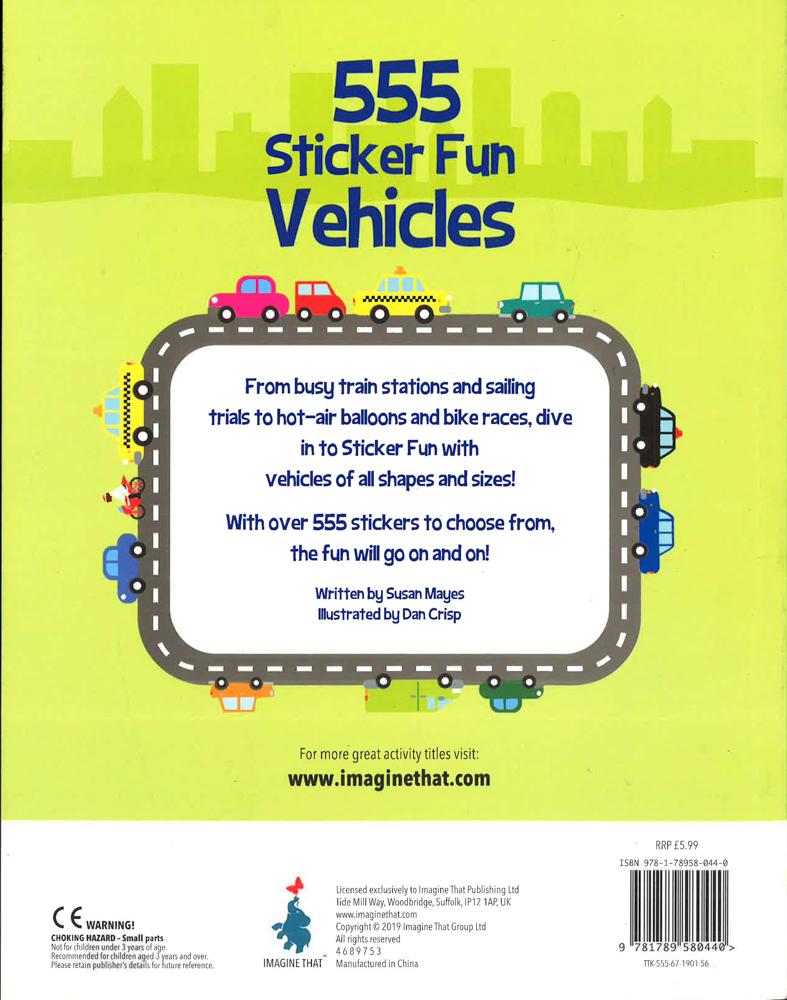 Create amazing transport scenes with this awesome vehicle sticker activity book for boys and girls age 5+. Written by Susan Mayes and illustrated by Dan Crisp, 555 Sticker Fun Vehicles features fun, bite-sized text which sets the stage for each illustrated vehicle-themed scene. From cars, aeroplanes, trains and diggers to motorbikes, supercars, space rockets and emergency vehicles, readers can complete the colourful transport scenes using the hundreds of vehicle stickers that are included. A perfect 'things that go' activity book to give to a child for vehicle sticker fun.