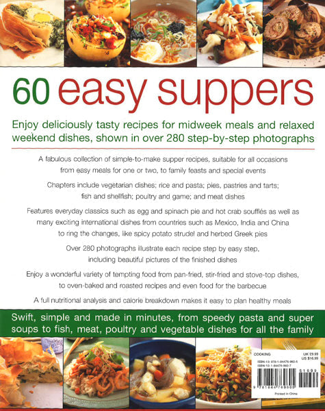 A fabulous collection of main-course recipes, suitable for all occasions from simple meals for one or two, to family feasts and special dinners.Enjoy deliciously tasty recipes for midweek meals and relaxed weekend dishes, shown in over 200 step-by-step photographs. This is a fabulous collection of main-course recipes, suitable for all occasions from simple meals for one or two, to family feasts and special dinners. The chapters include vegetable dishes; rice and pasta; pies, pastries and tarts; fish and shellfish; poultry and game; and meat dishes. It features over 200 colour photographs that illustrate each recipe step by easy step, and beautiful pictures of the finished dishes guarantee excellent presentation every time. It includes an incredibly wide variety of recipes from pan-fried and stir-fried dishes, stove-top dishes, oven-baked and roasted recipes and food for the barbecue. These delicious supper recipes are perfect for anyone with a busy life who enjoys good food without effort. Baked herb crepes with tomato sauce, Madras curry with savoury rice, and tamales filled with spiced pork are simple nutritious meals that can be prepared and eaten the same evening. Chicken Bakes with Shallots, Garlic and Fennel is a wonderful dish for a chilly day, while Salmon Risotto with Cucumber and Tarragon is perfect for a summer evening. Packed with dishes that are both easy to prepare and easy to serve, this is an inspirational, highly practical book full of recipes.